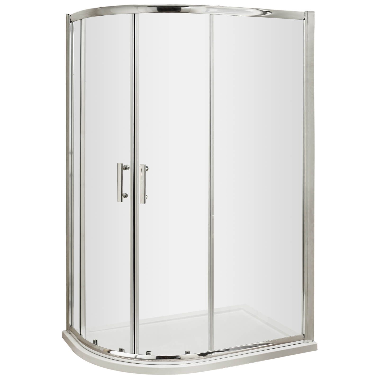 This offset quadrant is reversible; only the optional trays are left or right-handed. The illustrative image shown above is with an optional right-handed tray for installation on the right-hand corner walls. Right, and left-handed trays are available as an option at the top of the page.