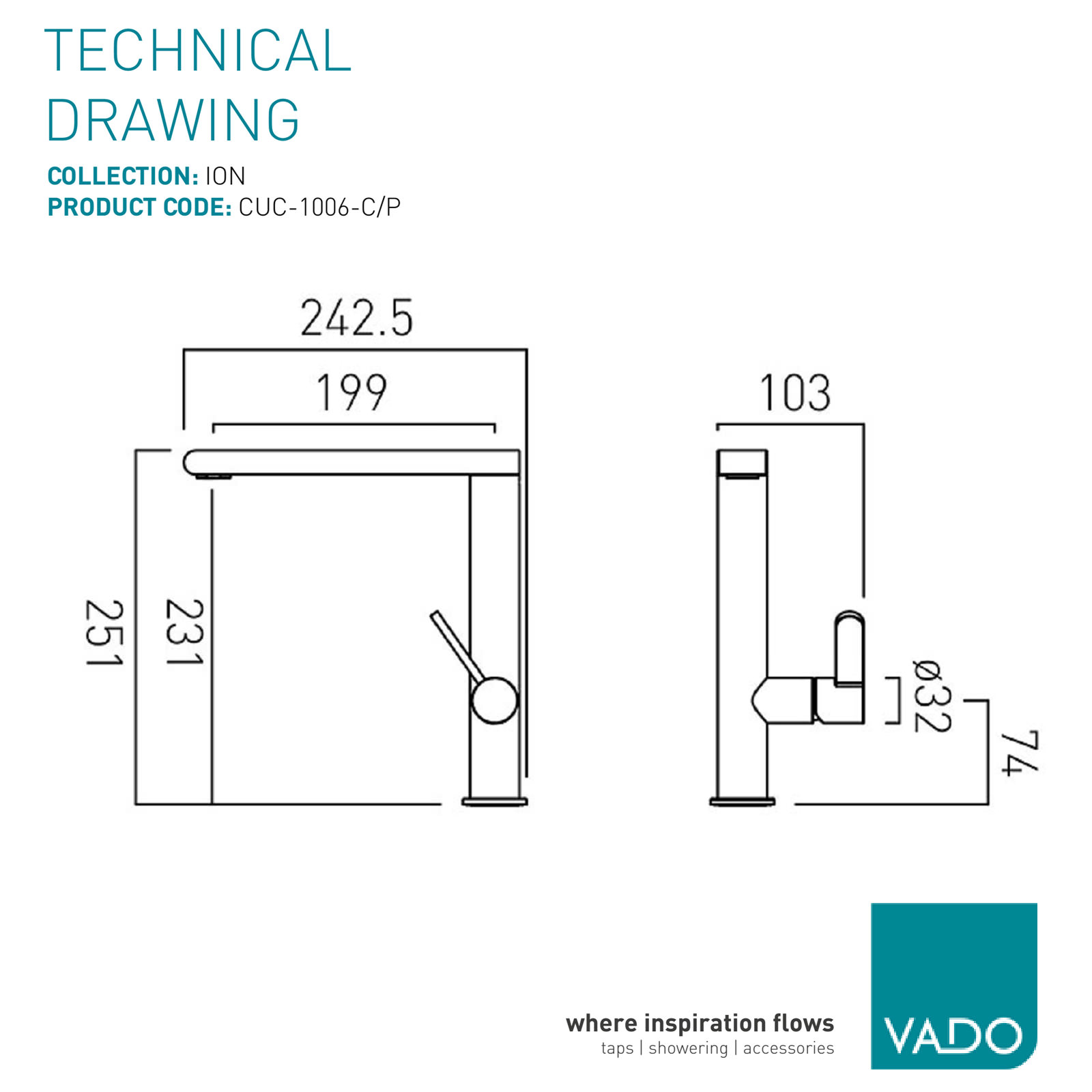 Vado Ion Mono Kitchen Sink Mixer Tap is a stylish chrome finish and simple design that engenders timeless appeal. It has a classic straight profile for optimal efficiency in cooking and cleaning activities at the sink. It features a deck-mounted installation and requires a minimum operating pressure of 1.0 bar at high pressure.