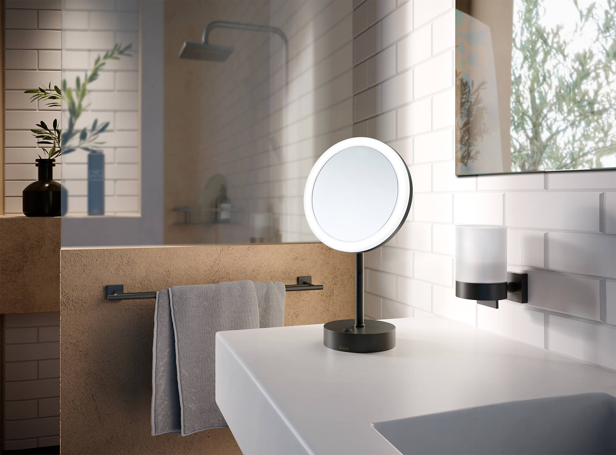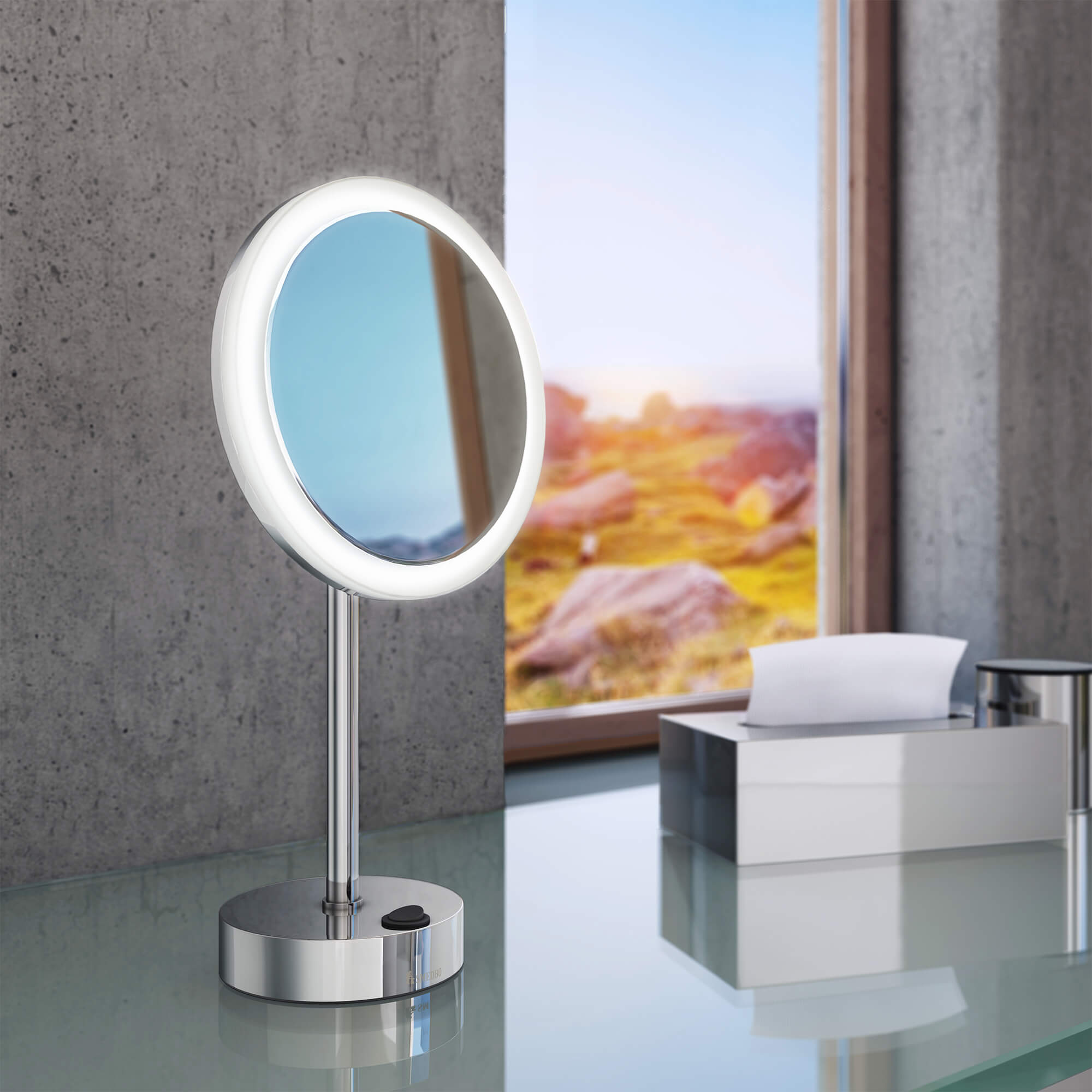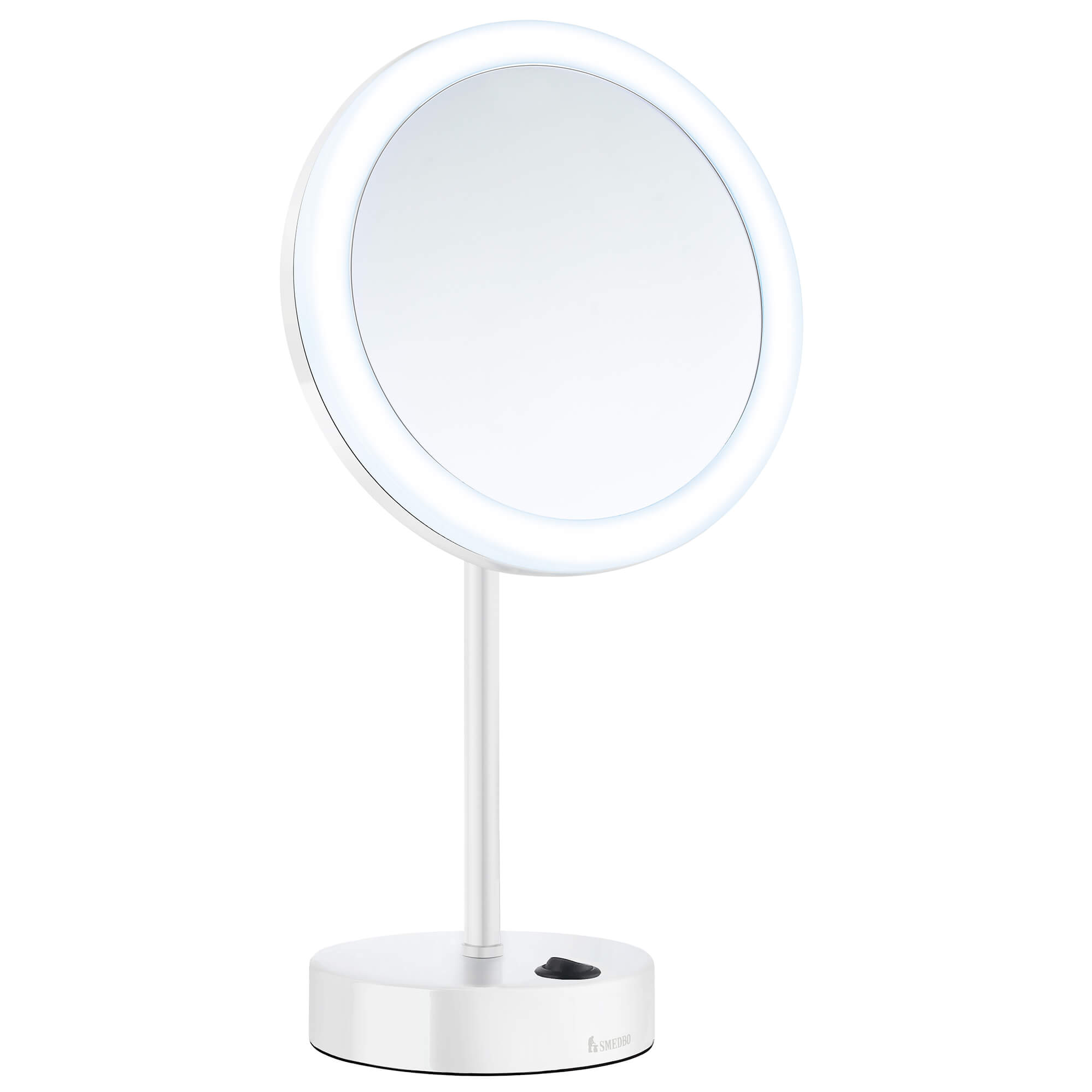 Smedbo Outline Free Standing Mirror is exquisite and simplistic at the same time.  It can be installed easily to create an aesthetic focal point that is certain to make your visitors envious. Its opulent form is constructed from the finest brass that gives this piece stability, solidity, and durability. It offers five times magnification to aid in shaving and make-up. This freestanding accessory is battery operated and backed by a 10-year warranty from the manufacturer. Choose from 3 charming finishes of Chrome, Matt Black and White.