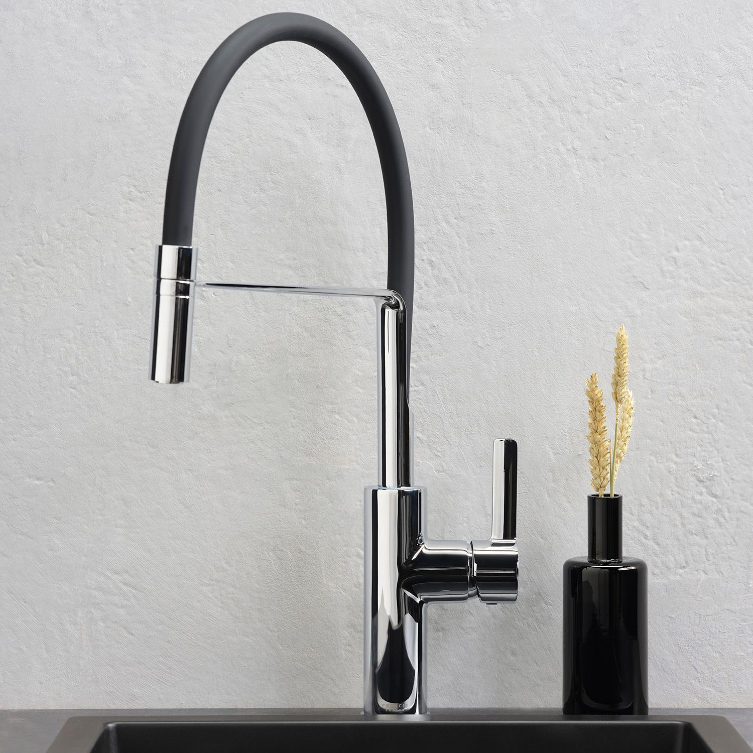 Reginox Aurora Single Lever Kitchen Mixer Tap With Pull-Out Hose is a transitional style water tap that will give your kitchen the best of both worlds. The Chrome And Black tap are tall, and features pull out hose to help clean and wash pots and pans. The product is suitable for Deck Mounted installation and allows for ease in kitchen chores thanks to its curved high spout. The mixer operates with a single handle with at least 0.5 Bar pressure.
