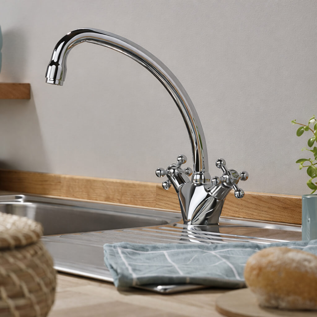 High functionality coupled with fabulous looks – that is what this Bristan Regency Easyfit Kitchen Sink Mixer Tap offers to delight you with. The product, which is part of the Regency range, boasts a stunningly functional unit. It comes with long life and also features a high-quality ceramic disc valve. Manufactured using brass material, it needs minimum 0.3 bar to maximum 5.0 bar water pressure for smooth working. This deck mounted model in chrome finish is backed by ten years guarantee against all manufacturing defects. Buy it from your favourite online store to enjoy fast delivery.