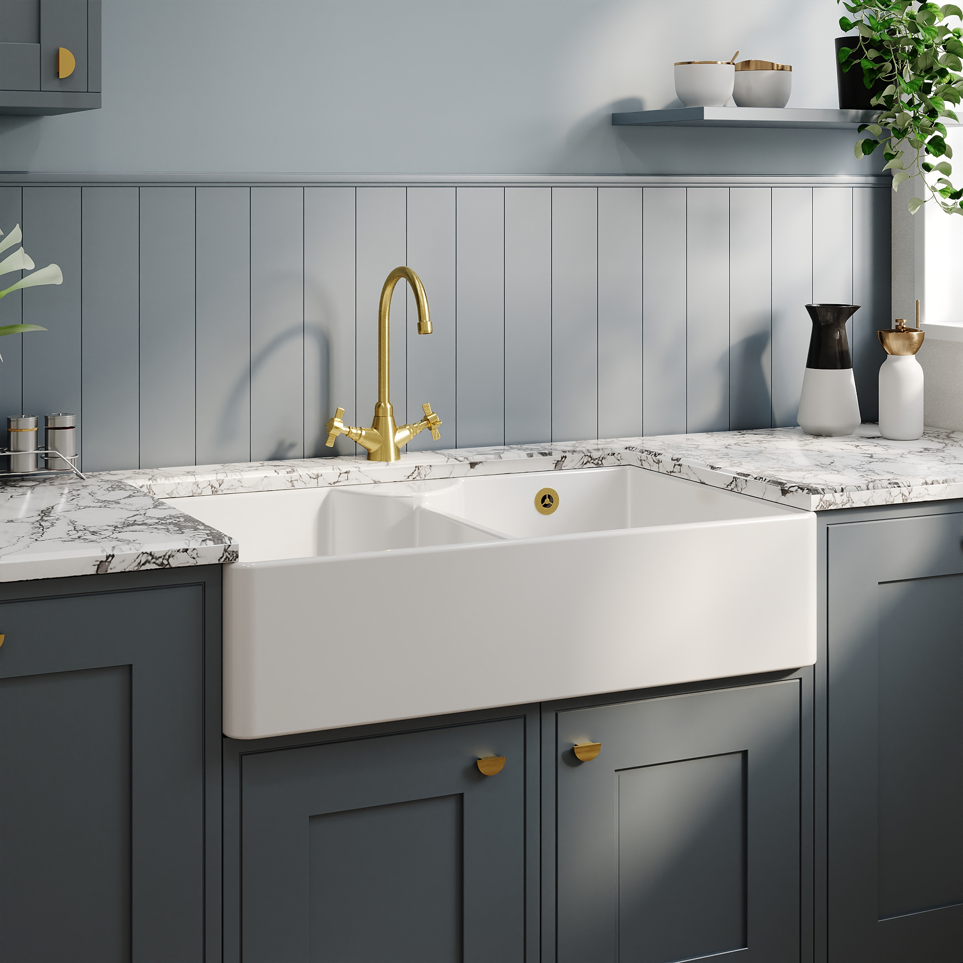 Nuie Butler Traditional Fireclay Kitchen Sink with Stepped Weir 895 x 550mm - Double Bowl
