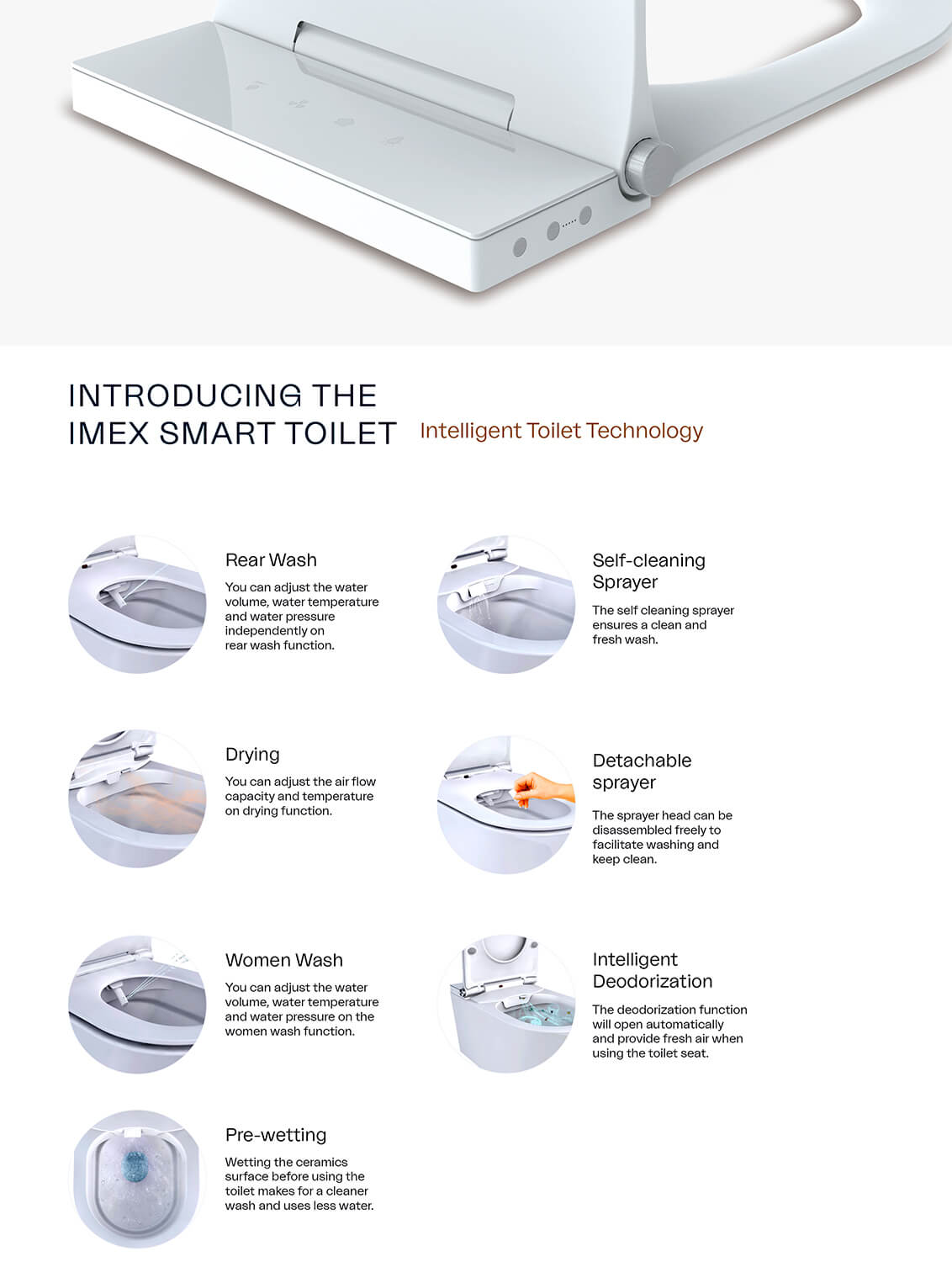 Imex Essence Back To Wall Rimless Smart Toilet with Soft Close Seat - White - 370 x 595mm