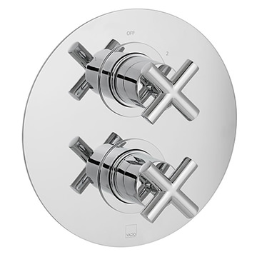 Vado Individual Elements 2 Outlet Round Concealed Thermostatic Shower Valve assumes a traditional aspect with crosshead handles that appear to be inspired by period styling but give a modern twist. It features separate controls to adjust water flow and set temperature while maintaining stability in the event of sudden fluctuations in temperature and even shutting down in case of failure of cold water supply to prevent burns and scalding.