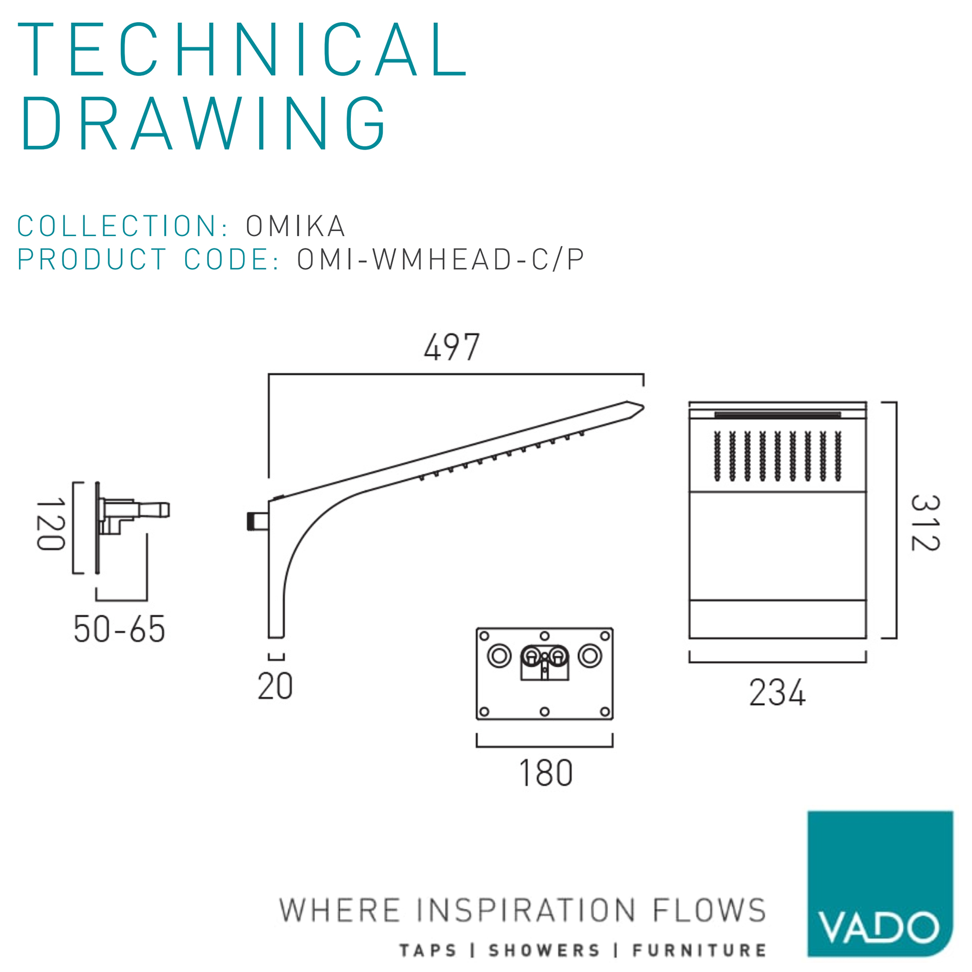 Vado Omika Rectangular Fixed Polished Chrome Shower Head - Two Spray Modes.