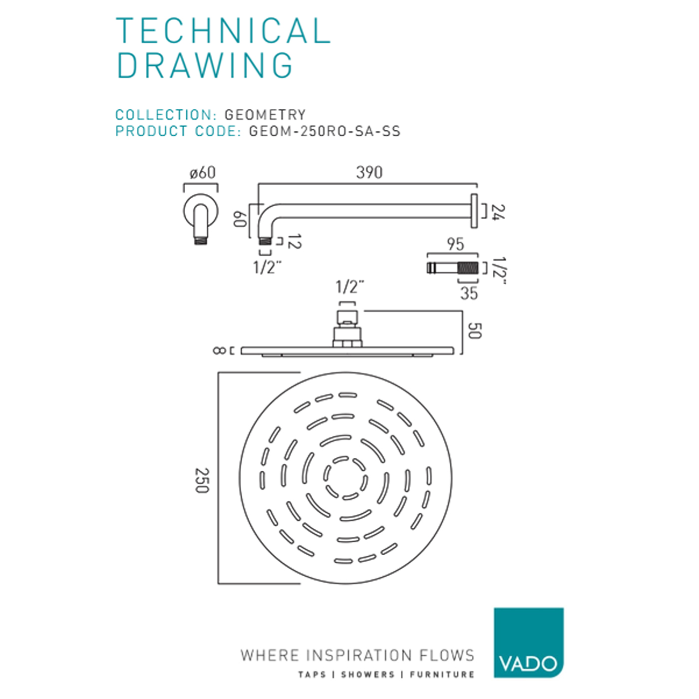 Vado Geometry Fixed Chrome Shower Head with Arm 250 x 250mm - Single Spray Mode.