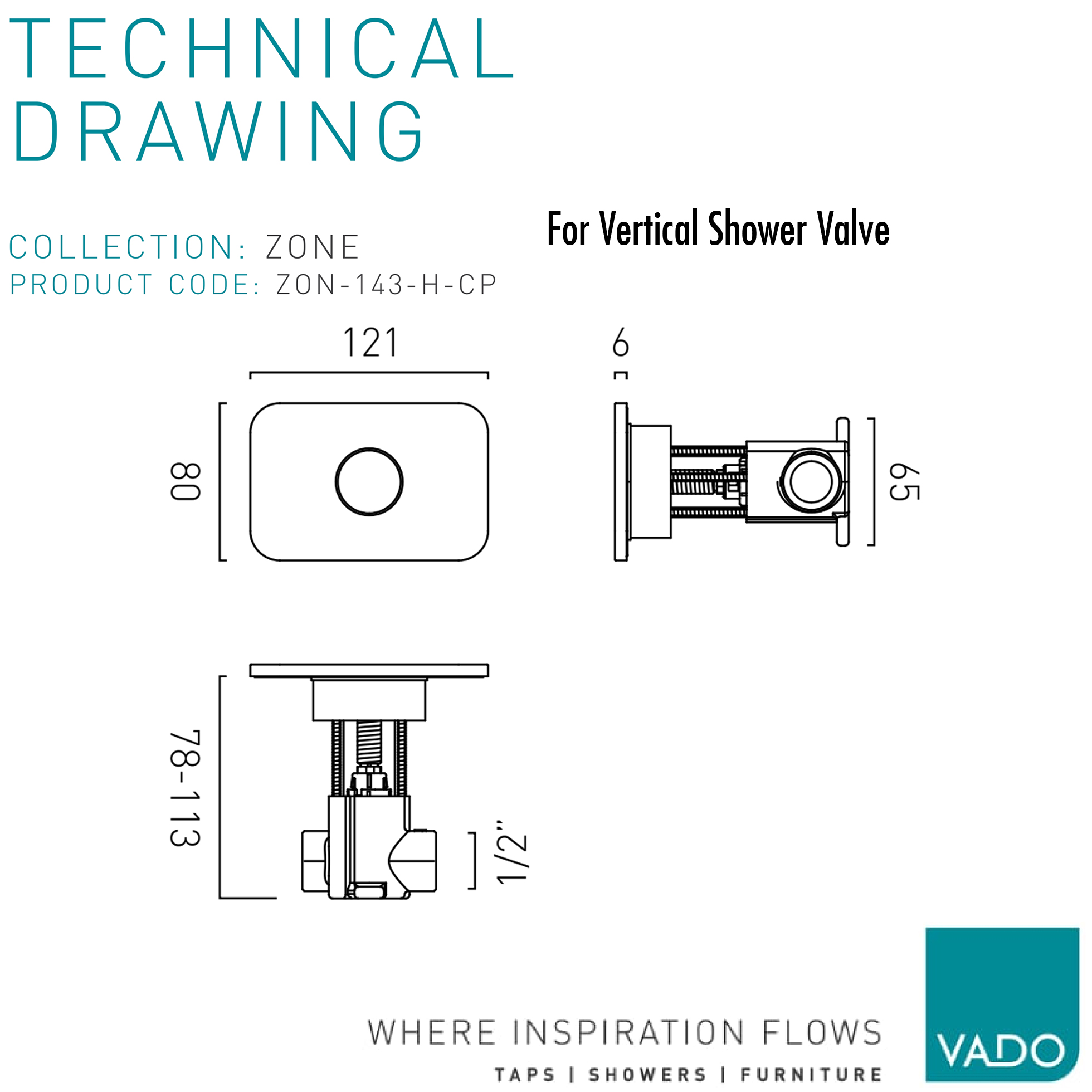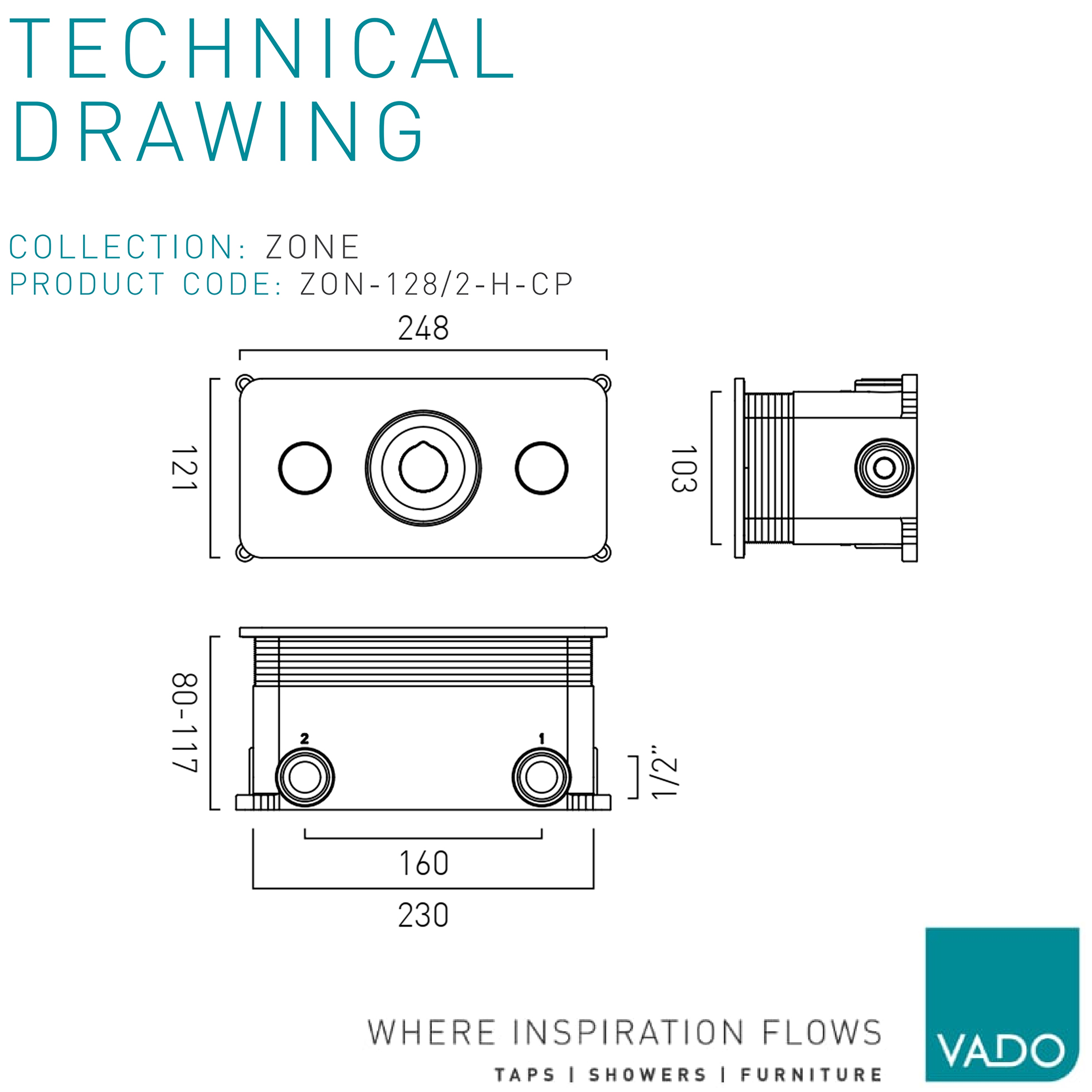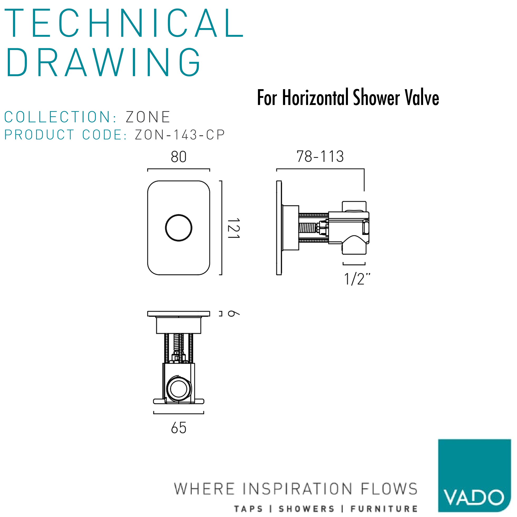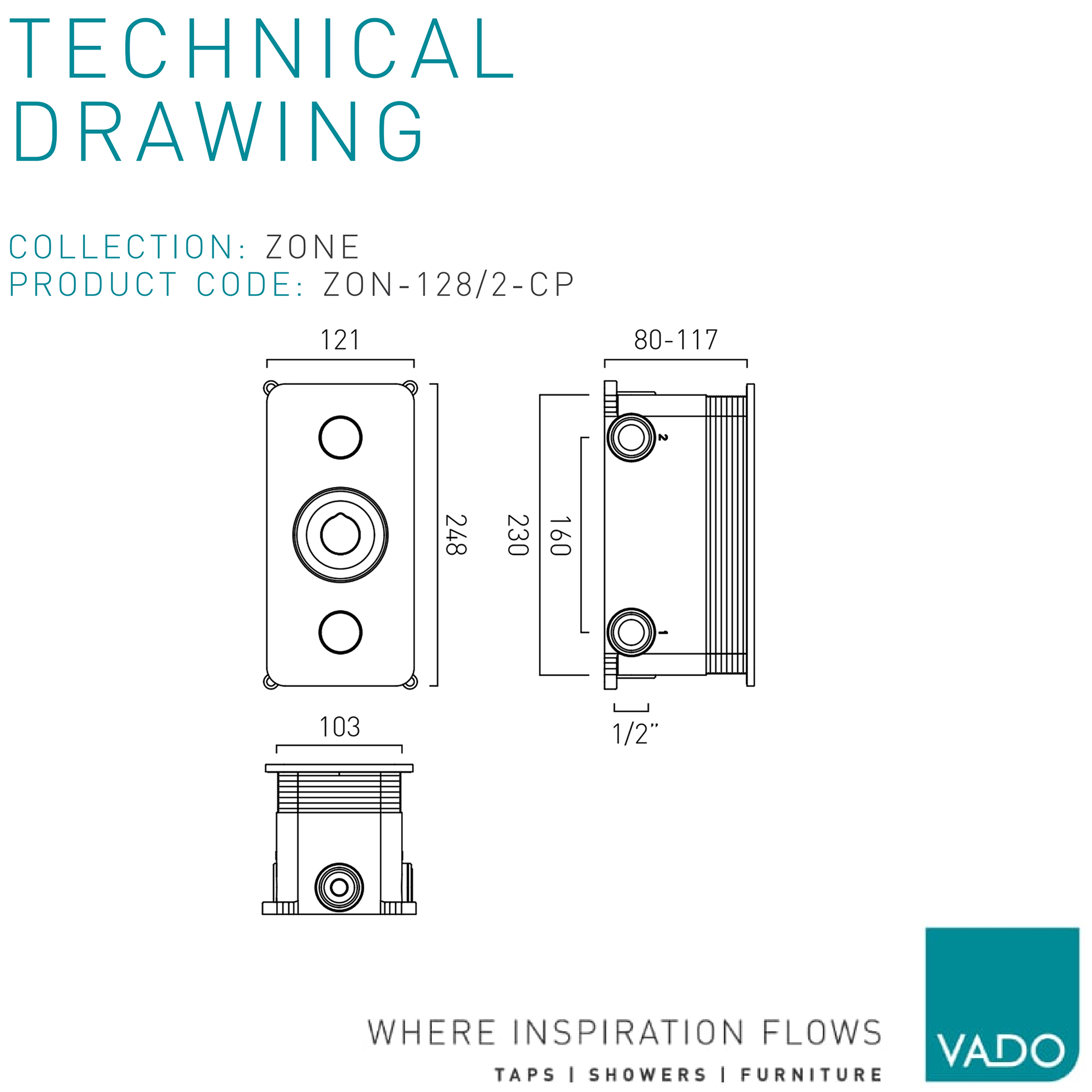 Vado Zone Concealed Rectangular Thermostatic Chrome Shower Valve - 3 Controls.