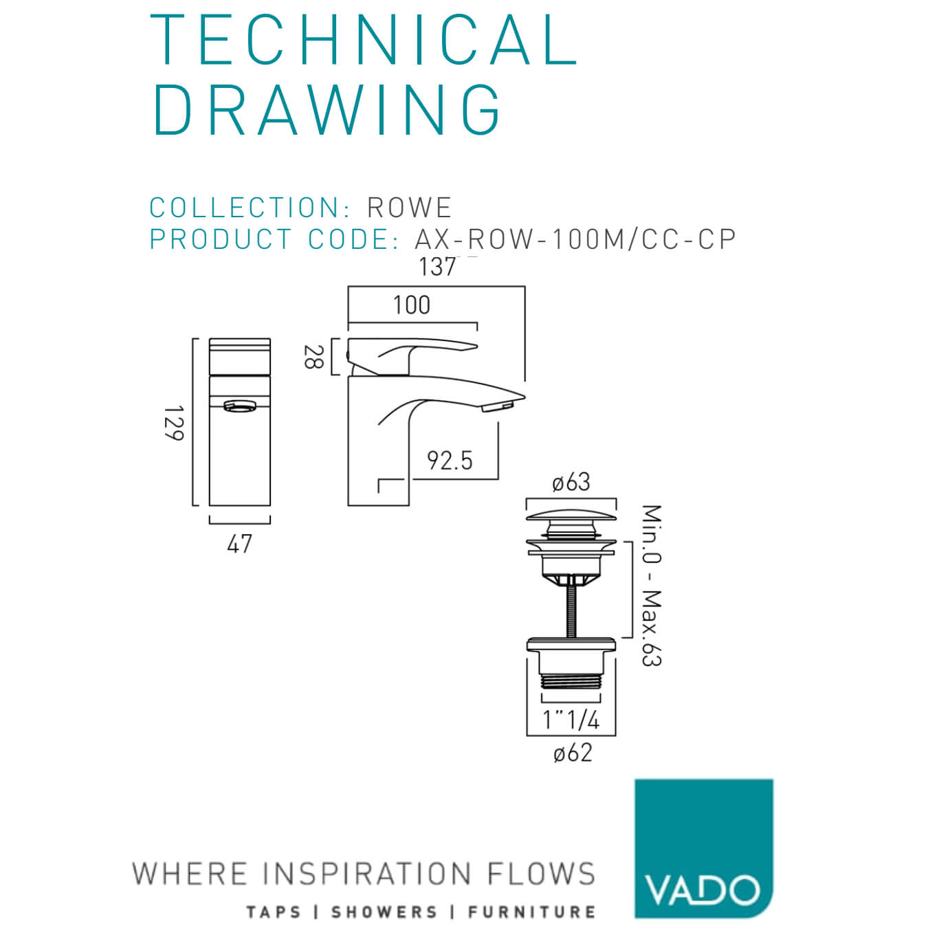 Vado Rowe Chrome Basin Mixer Tap with Push Basin Waste - Curved Lever Handle.