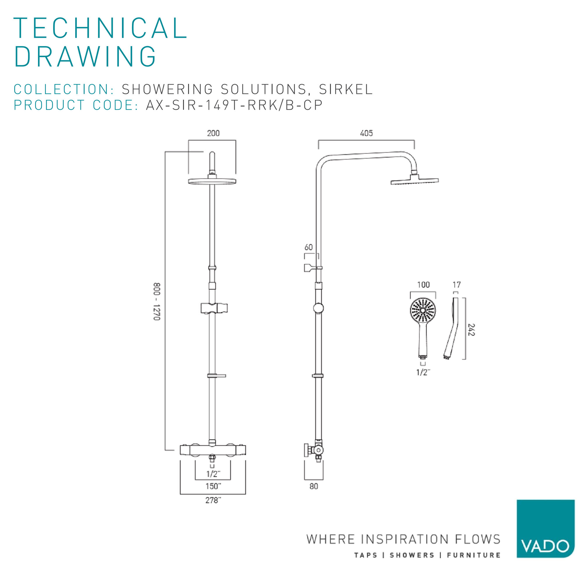 Vado Sirkel Chrome Exposed Thermostatic Bar Mixer Valve with Shower Head and Handset
