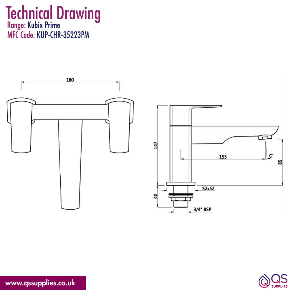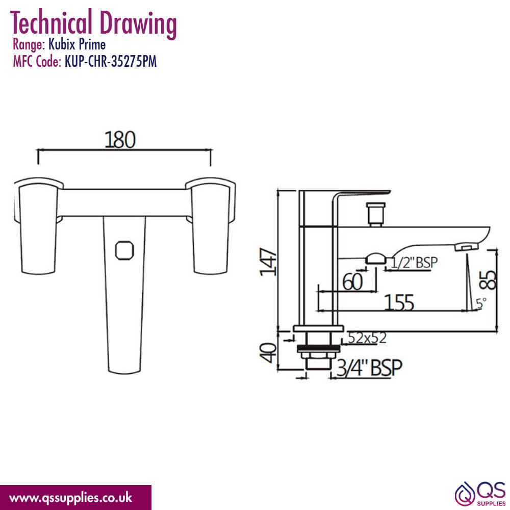 Jaquar Kubix Prime H Type Bath Mixer Tap - Flat Handle - Deck Mounted