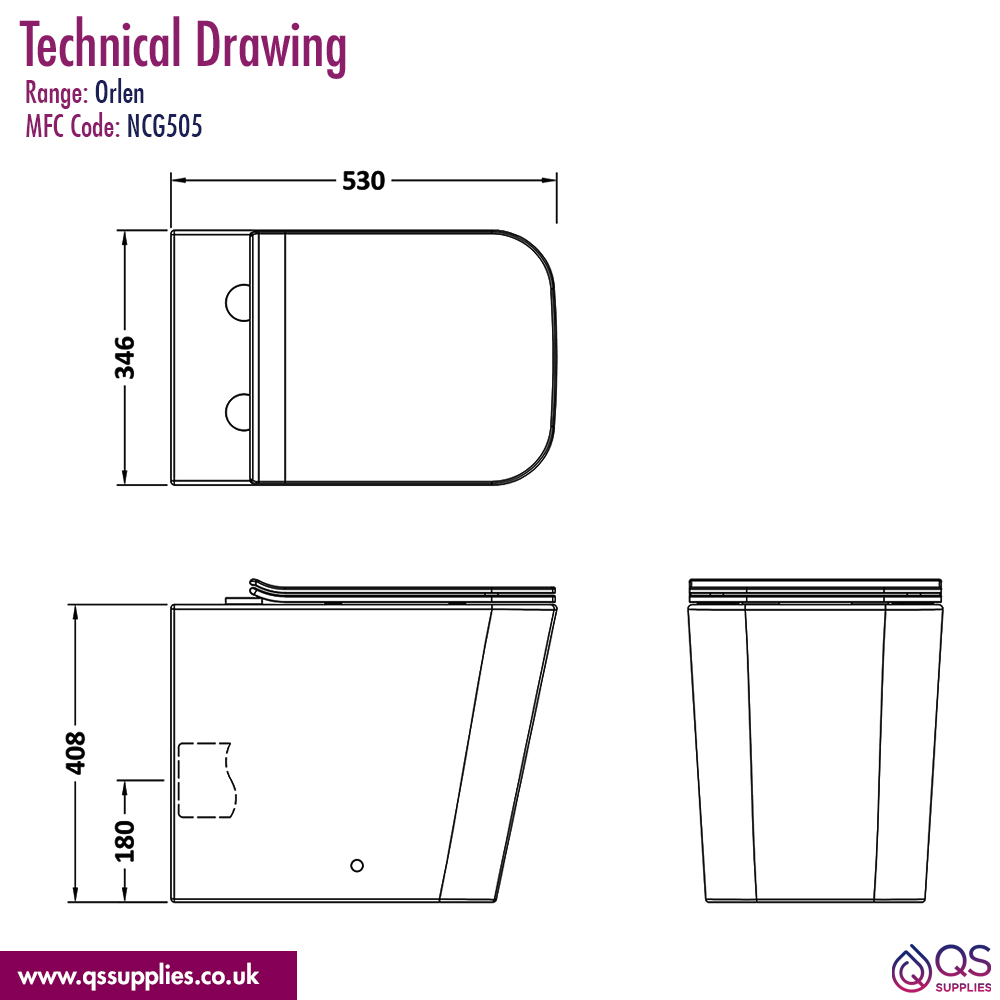 Nuie Orlen Rimless Back-To-Wall White WC Pan and Soft Close Seat - 346 x 530mm.