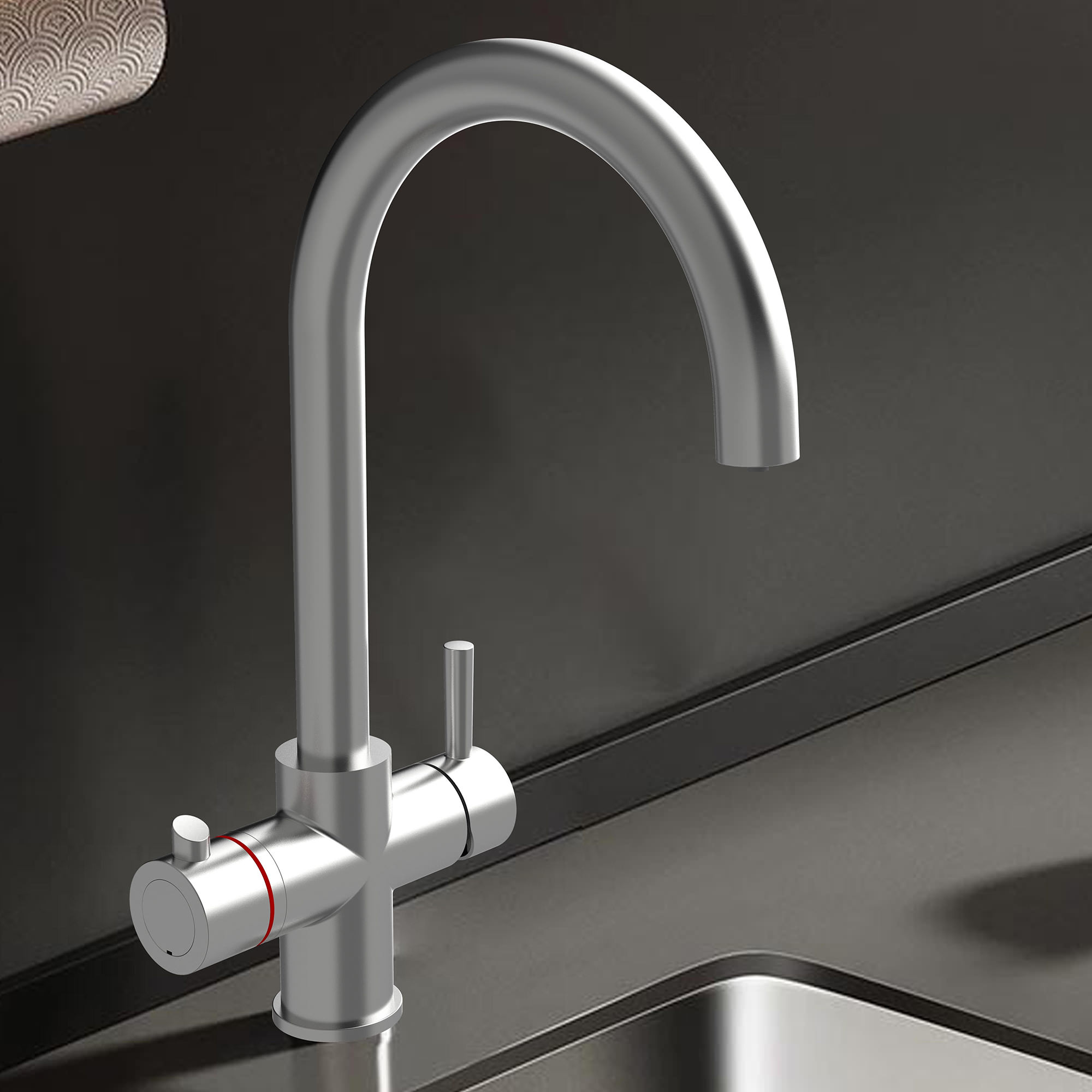 Boiling water taps provide instant boiling water at about 98 degrees centigrade and save energy and money in the long run. Perfect for quick tea and coffee, these taps are faster than kettles or saucepans for providing hot water and work by using a tank below the sink. Hot water is heated and stored in the storage tank; whenever you turn the tap lever, you can instantly get hot water. Most importantly, these taps have a separate button or switch that allows access to the hot water, making them very safe. These taps come in a range of styles, with 3-in-1 or 4-in-1 functionality, which can switch between hot, cold, and boiling water as needed.