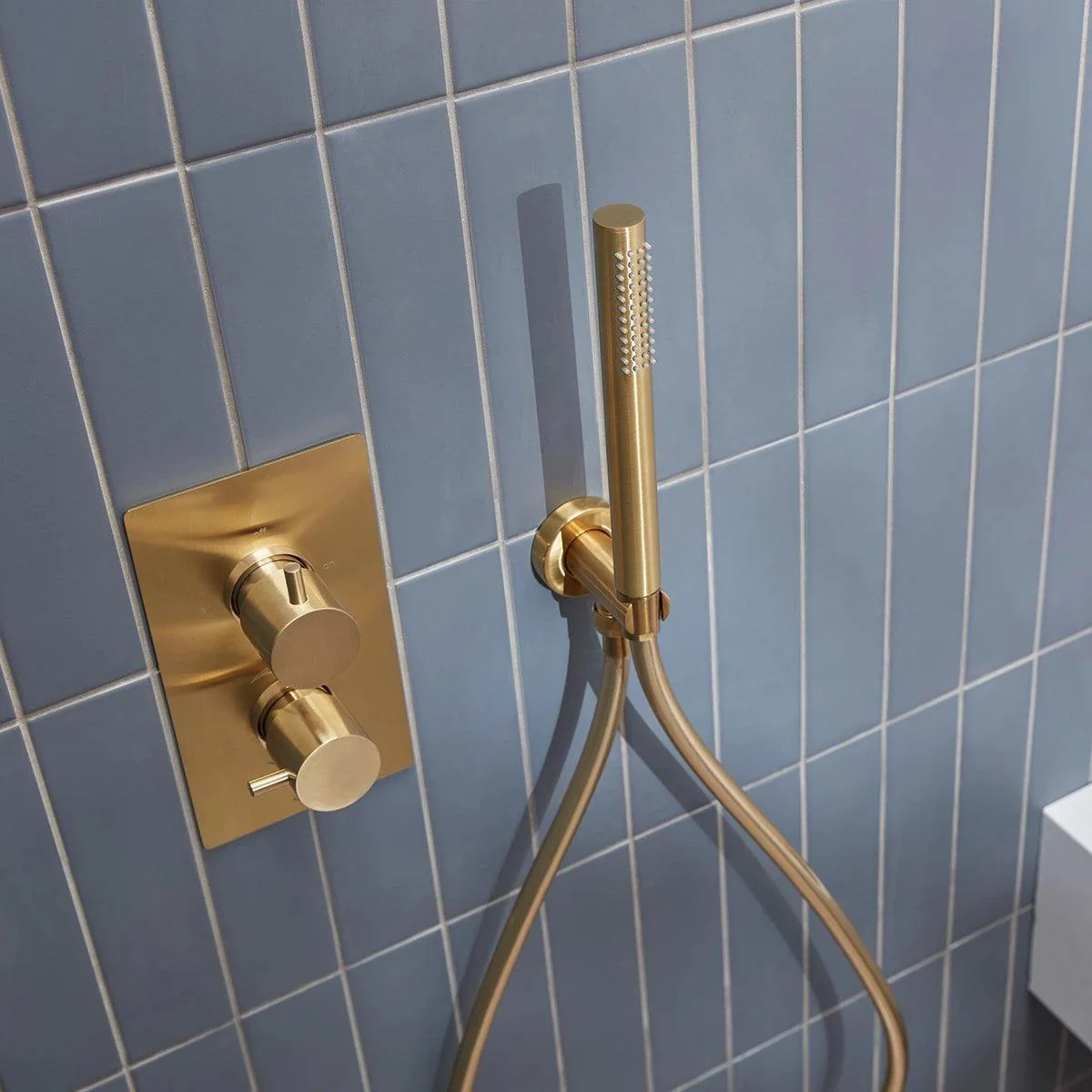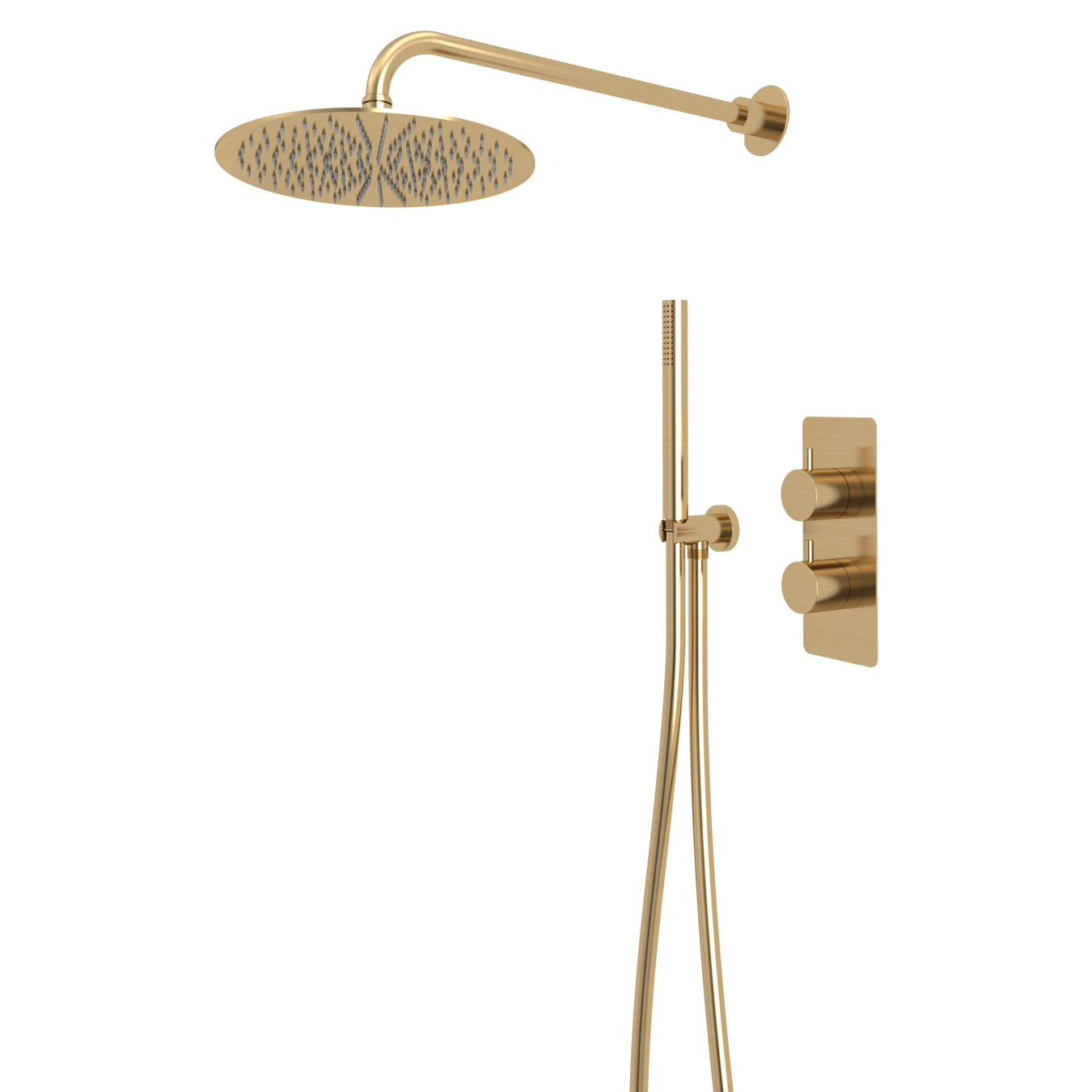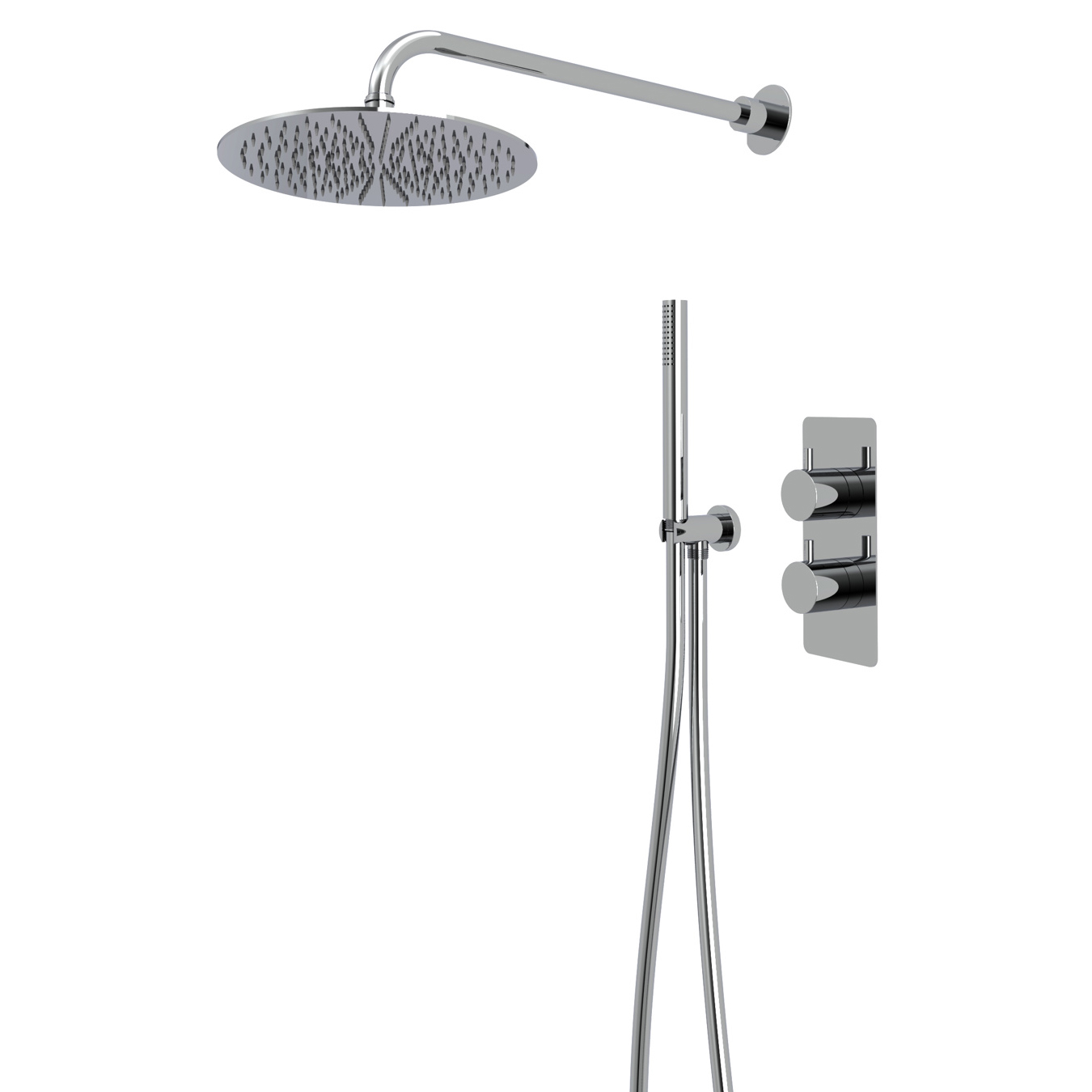 The knob handles offer full control over temperature with an independent control to switch it on/off. It comes finished in four sleek finishes, making it an ideal candidate for the cool, modern shower space. It comes with an evocative overhead round shower. This valve can be matched to surroundings that share similar geometry, and the broad shower rose provides an enveloping experience. Being fitted with a secondary shower handset, this unit provides useful rinsing options.