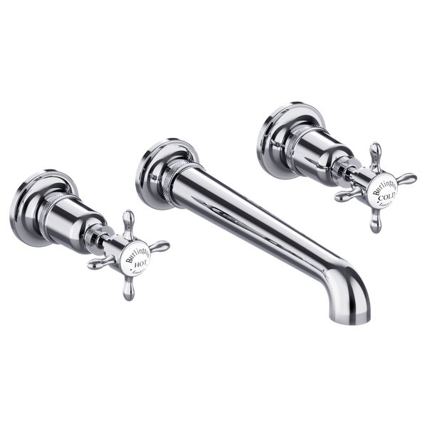 Burlington Guild 3 Hole Traditional Basin Mixer Tap with Long Spout - Crosshead Handles - Wall Mounted
