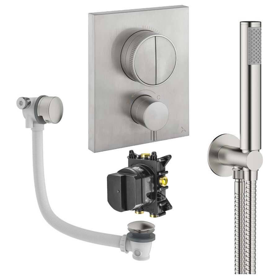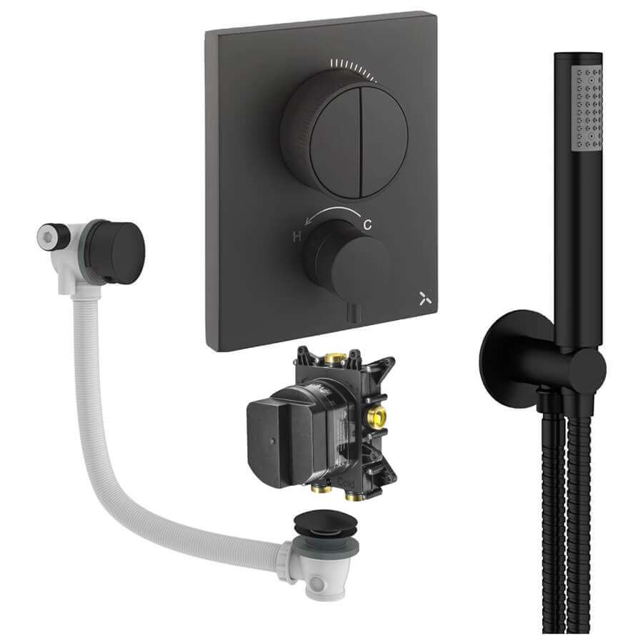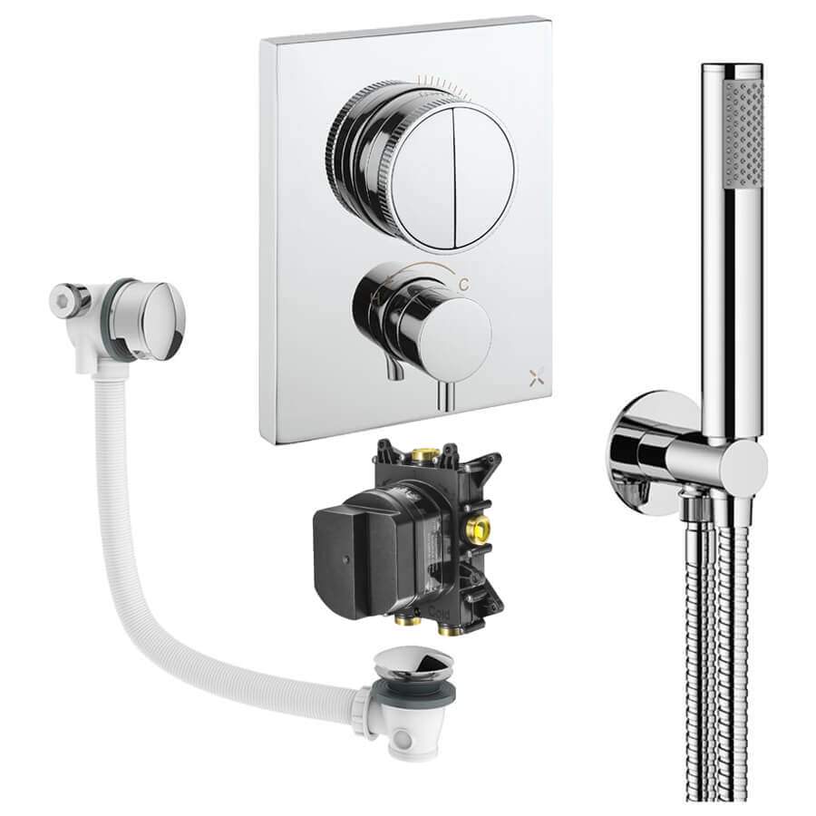 • Product Includes: Shower Valve, Thermostatic CrossBox (Concealed Part), Shower Kit: Handset and Hose, Bath Filler with Waste