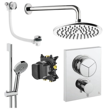 • Product Includes: Shower Valve, Thermostatic CrossBox (Concealed Part), Shower Kit: Handset and Hose, Fixed Head with Arm, Bath Filler with Waste