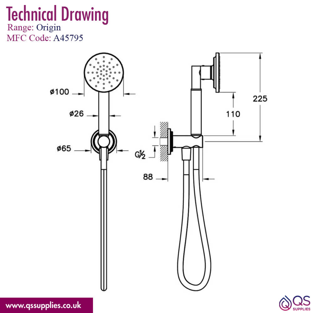 VitrA Origin Classic Hand Shower Kit 100 x 130mm - Hose and Wall Bracket - Single Spray Mode