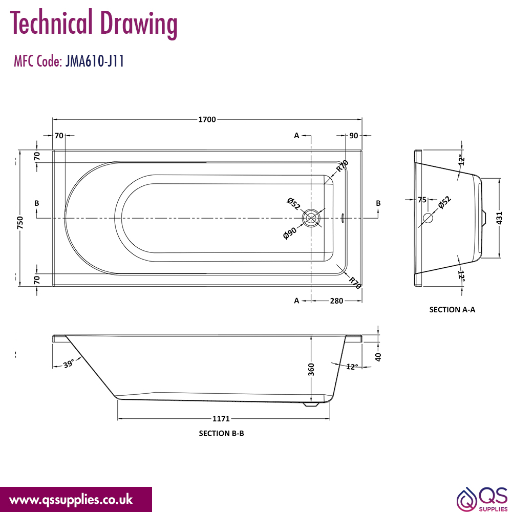 Joseph Miles Single Ended Built-In Whirlpool Bath 1700mm - 11 Jets