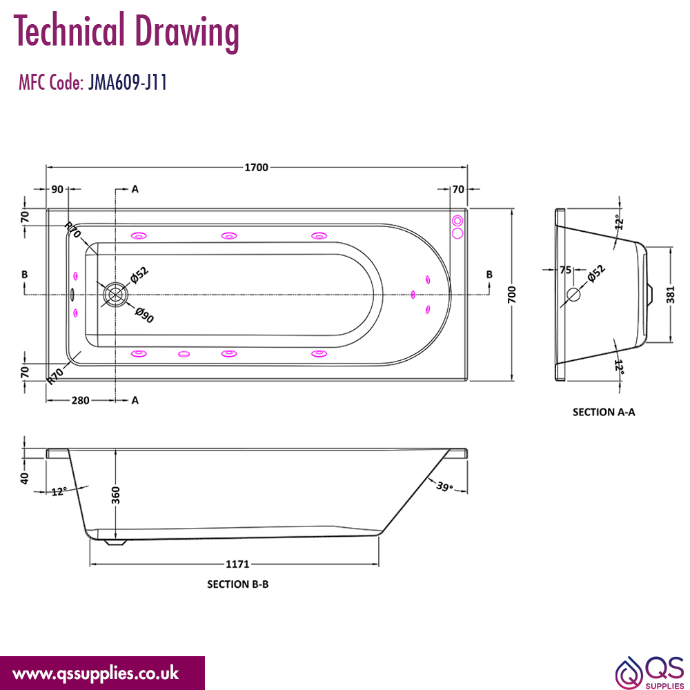 Joseph Miles Single Ended Built-In Whirlpool Bath 1700mm - 11 Jet