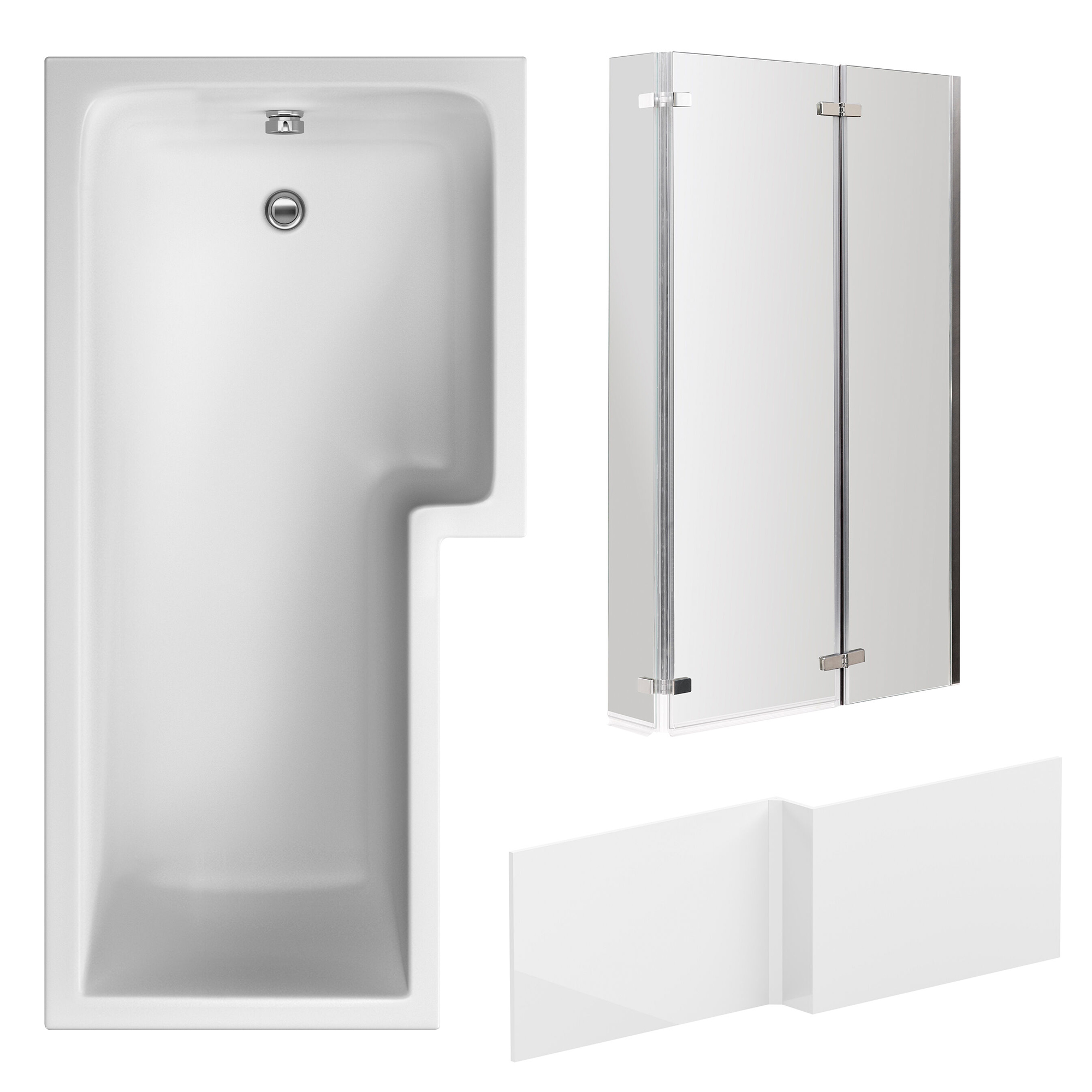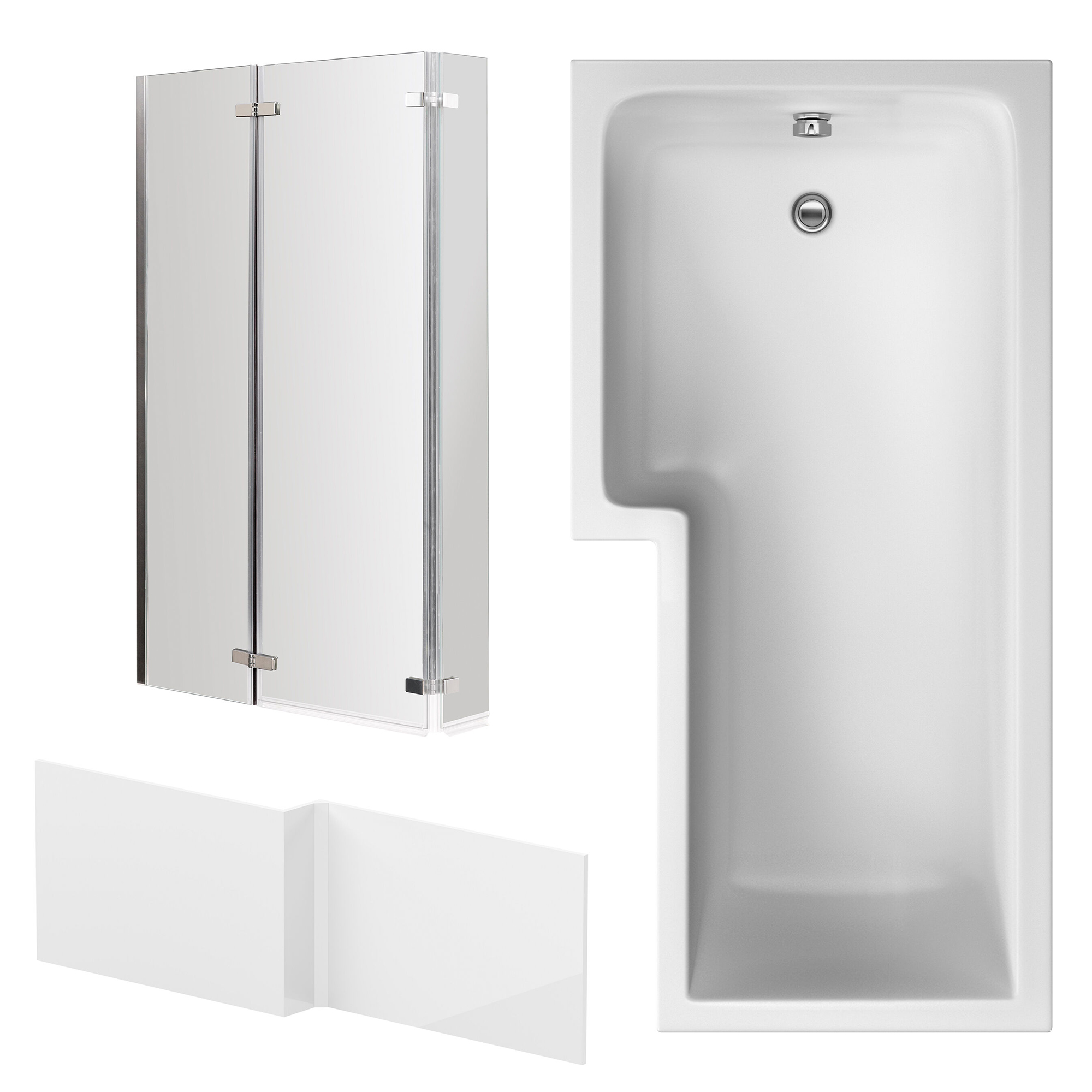 Nuie White L-Shaped Shower Bath With Front Panel and Hinged Screen 1700 x 850mm