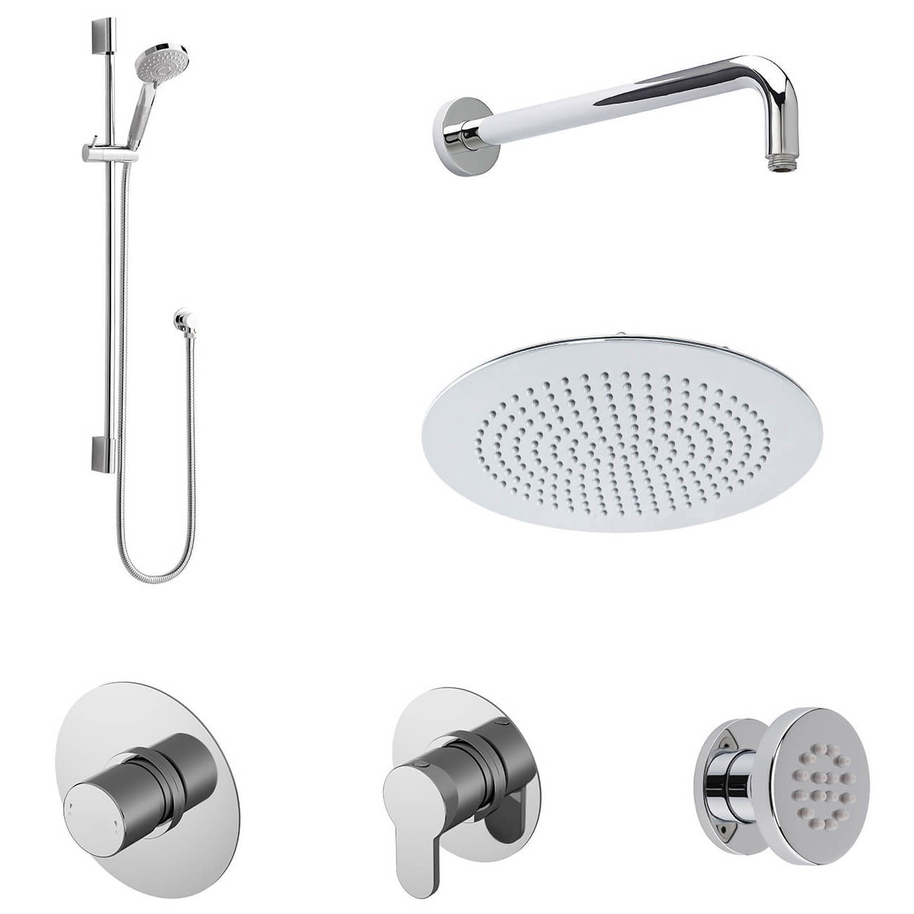 • Pack Includes: Thermostatic Valve, 3x Stop Valve, Slide Rail Kit, 3x Body Jets and Showerhead with Arm