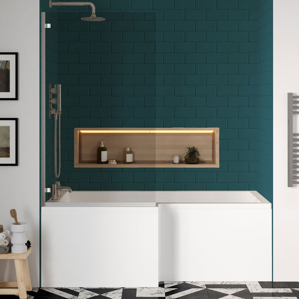 Nuie White L-Shaped Shower Bath With Front Panel and Chrome Screen 1700 x 850mm