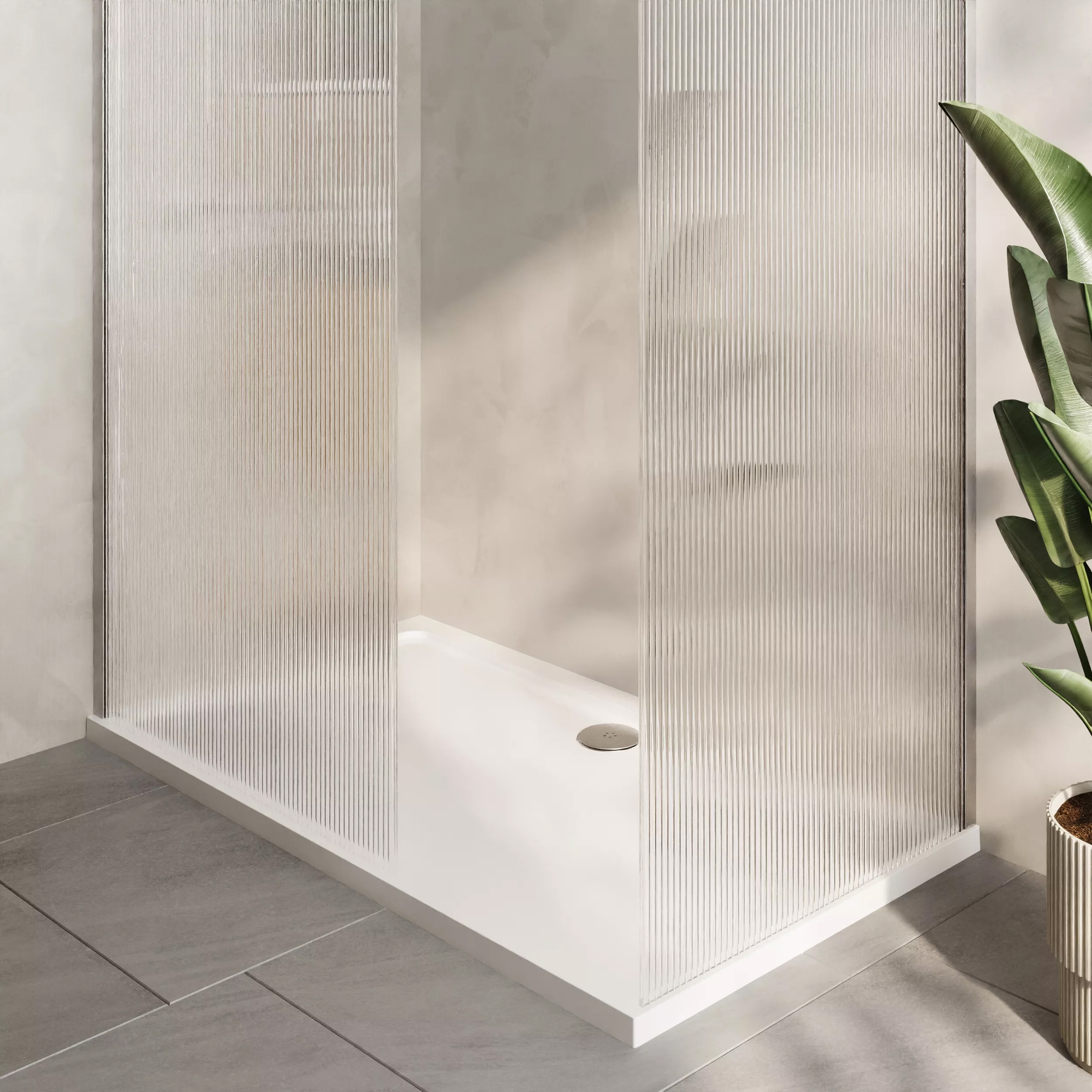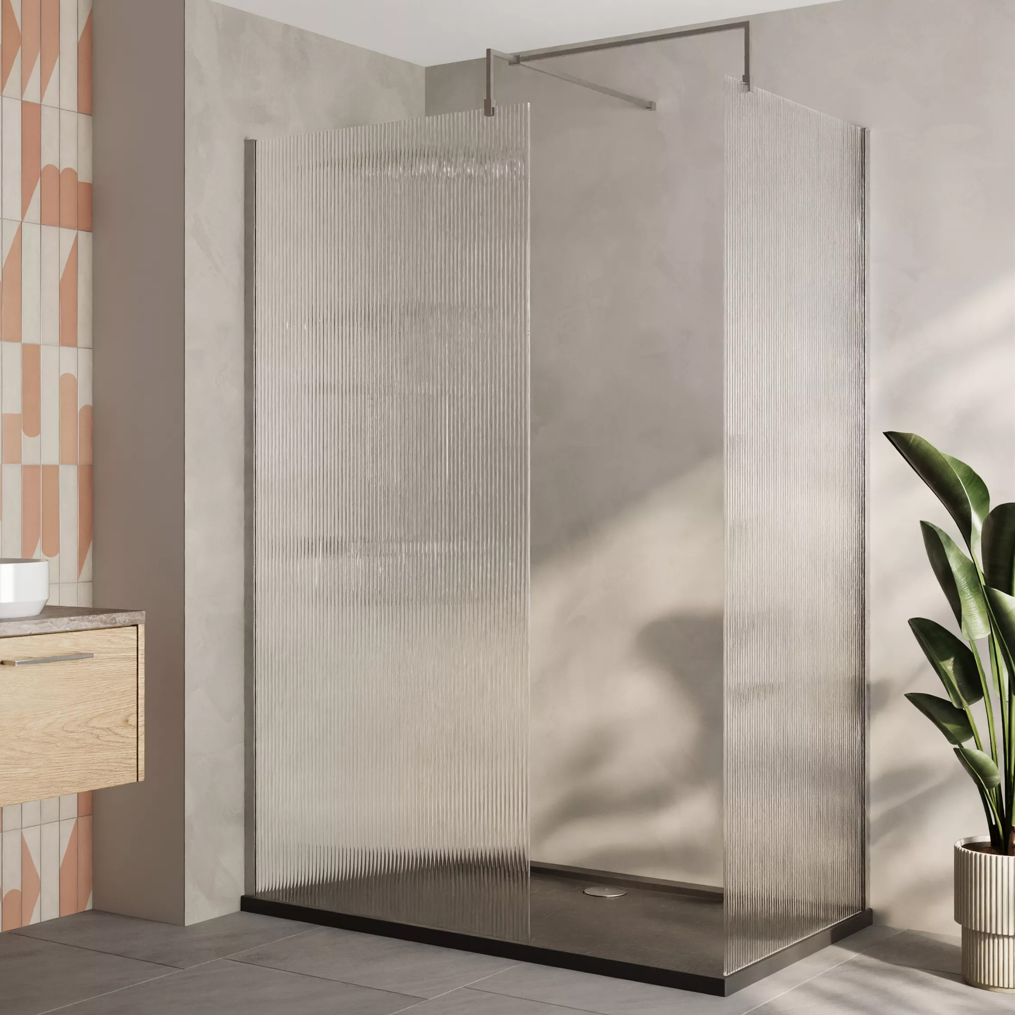 Nuie Frameless Fluted Glass Walk-In Shower Enclosure with Support Bars and Rectangular Tray.
