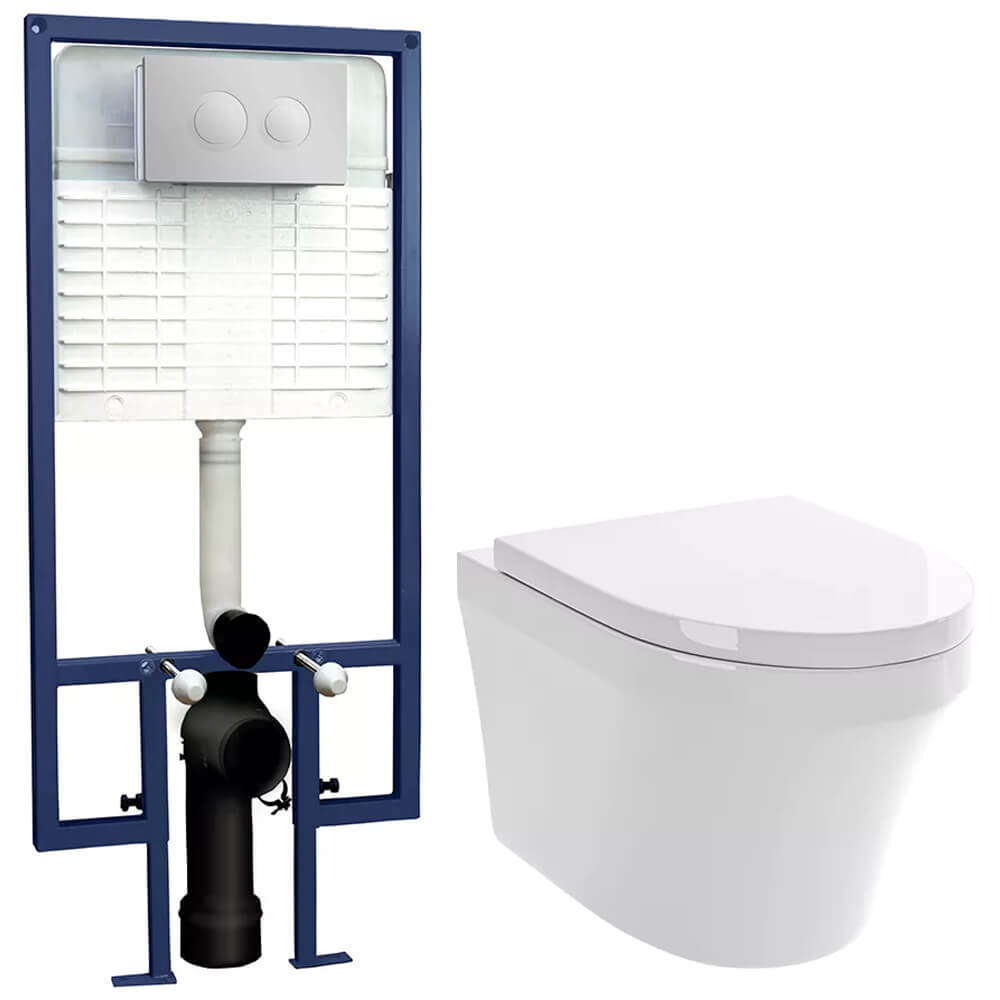 • Includes: Wall Hung Rimless Toilet with Soft-Close Seat, Concealed Cistern and Wall Frame and Dual-Flush Button Flush Plate