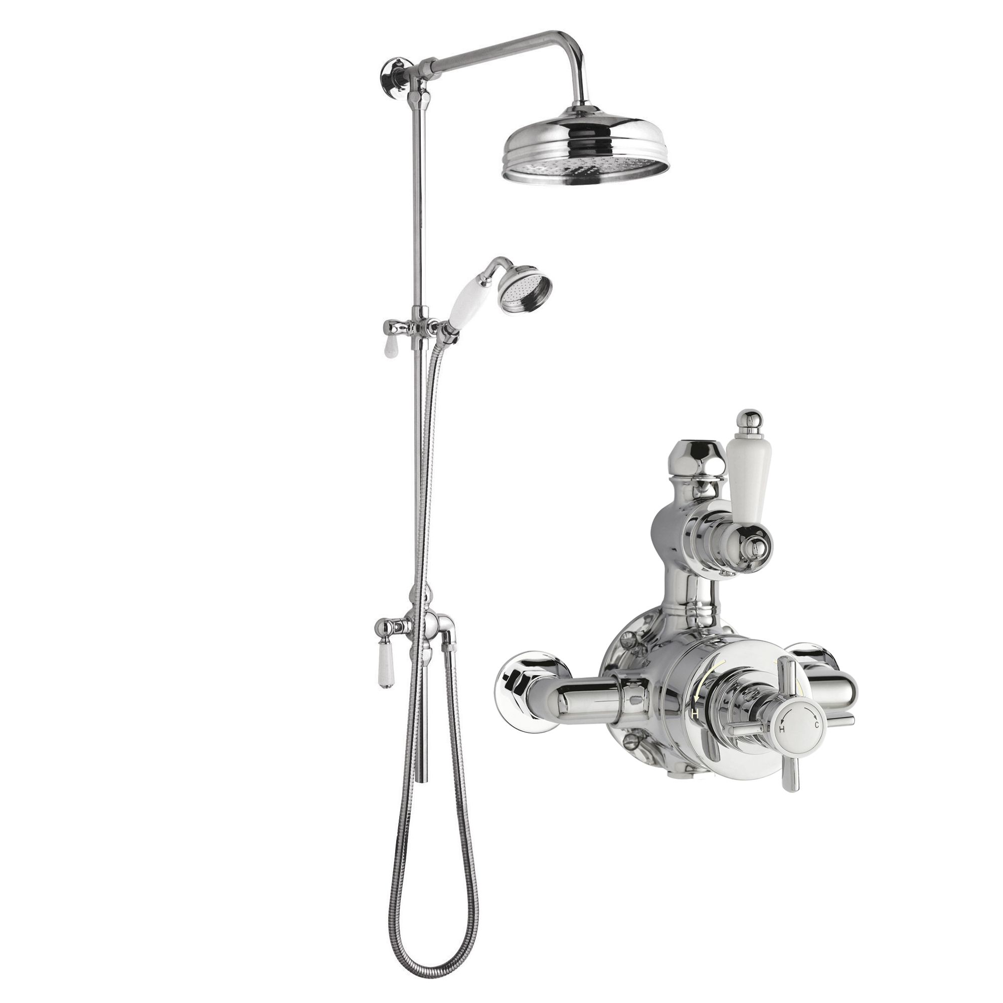• Pack Includes: Twin Thermostatic Shower Valve, Rigid Riser with Handset and Hose