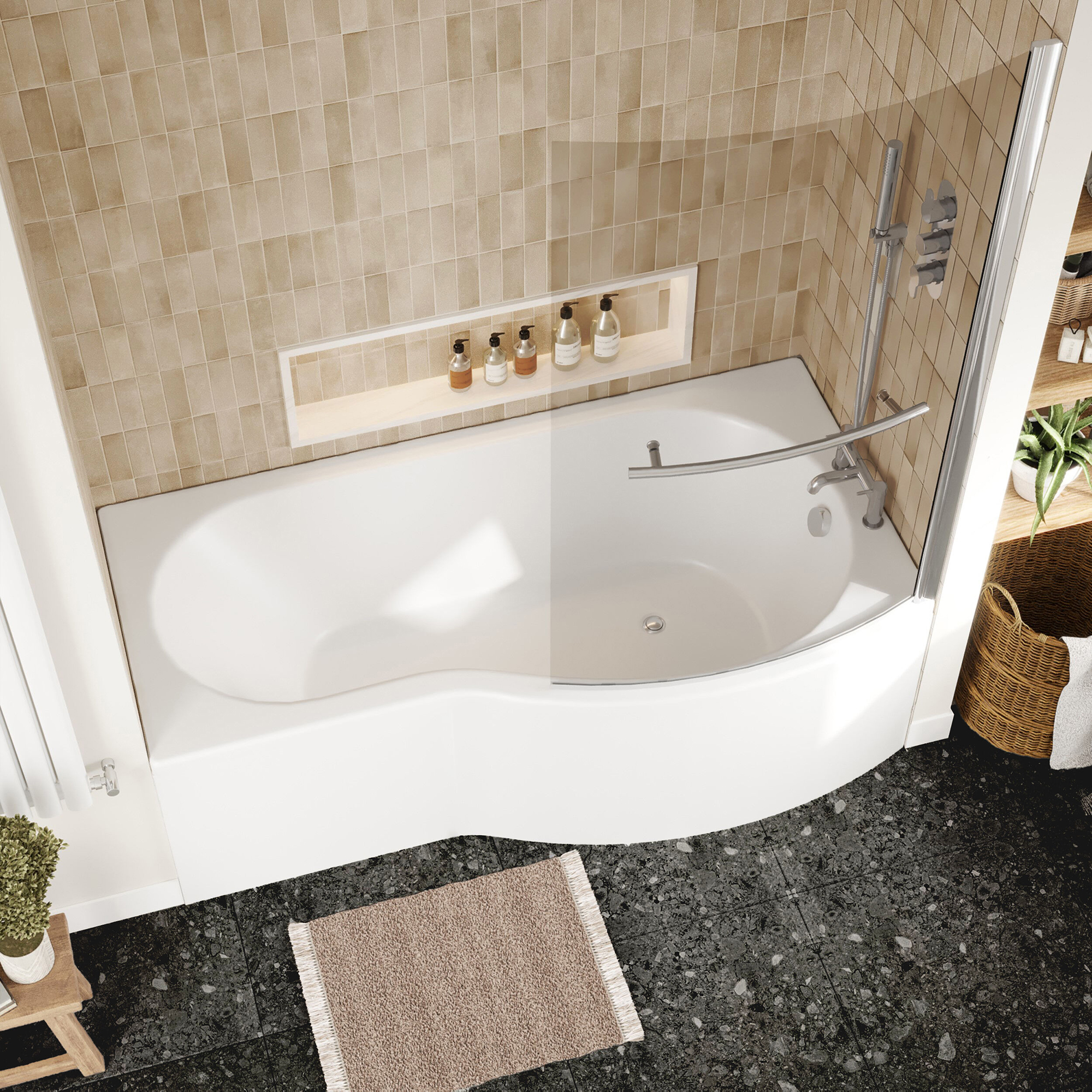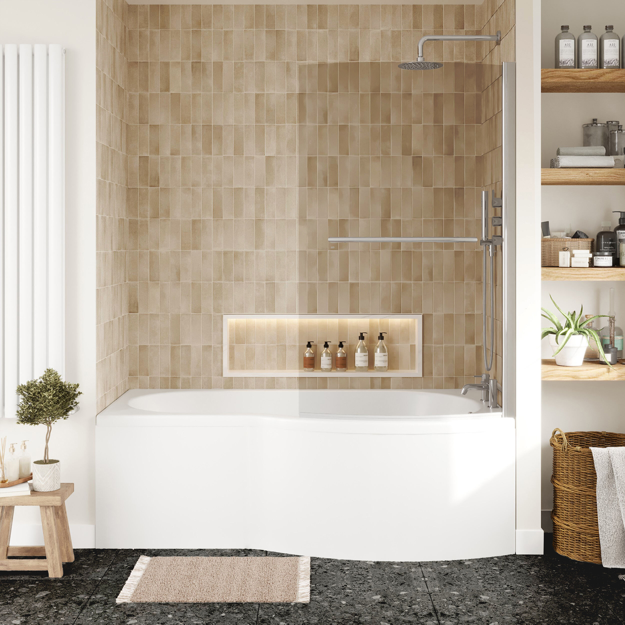 Nuie White B-Shaped Shower Bath with Front Panel and Curved Bath Screen 1700 x 900mm