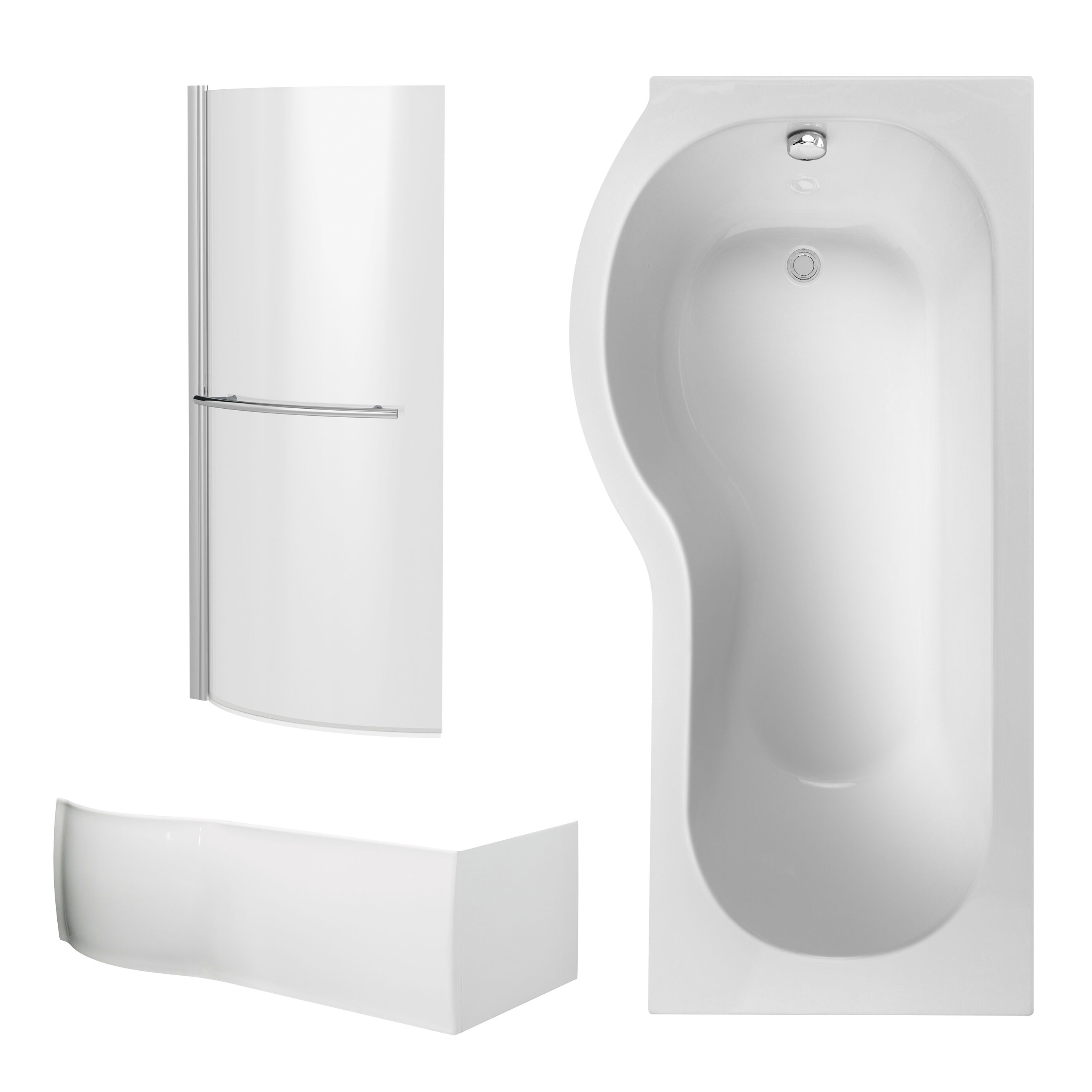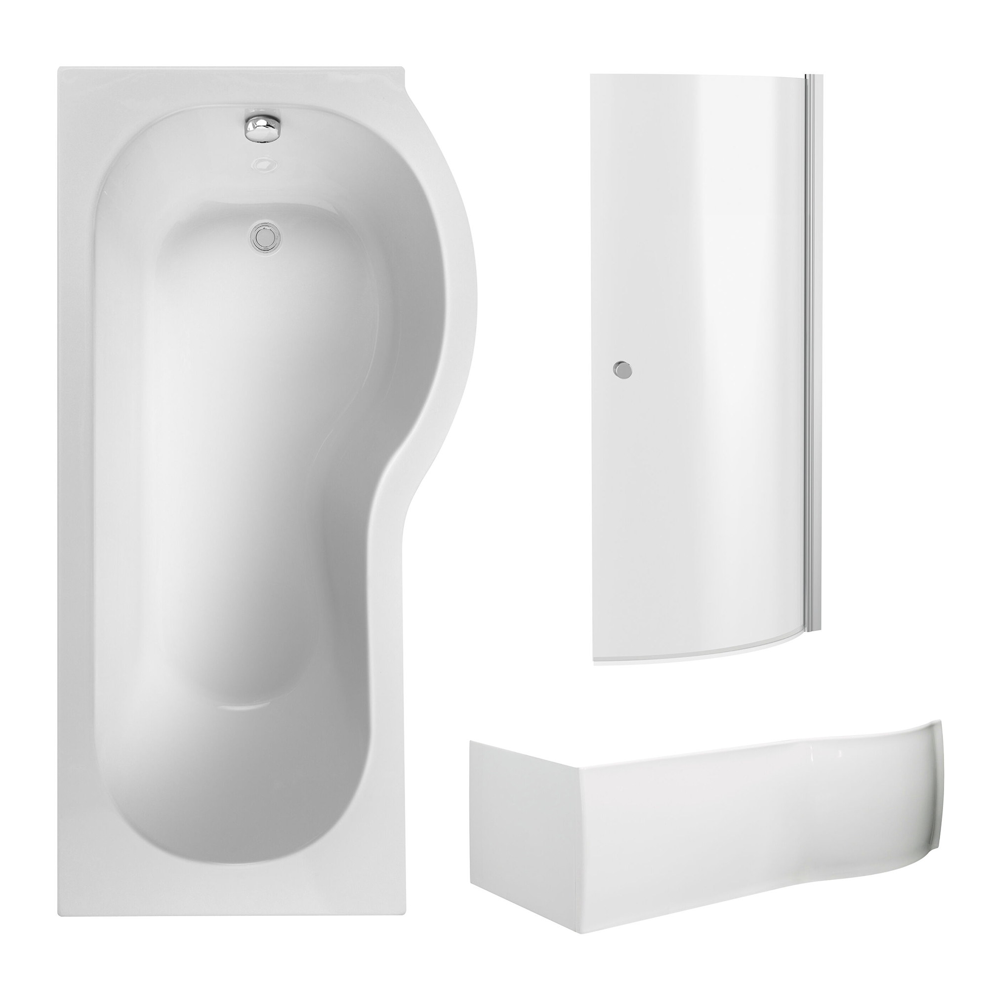 Nuie White P-Shaped Shower Bath with Front Panel and Curved Bath Screen 1700 x 850mm