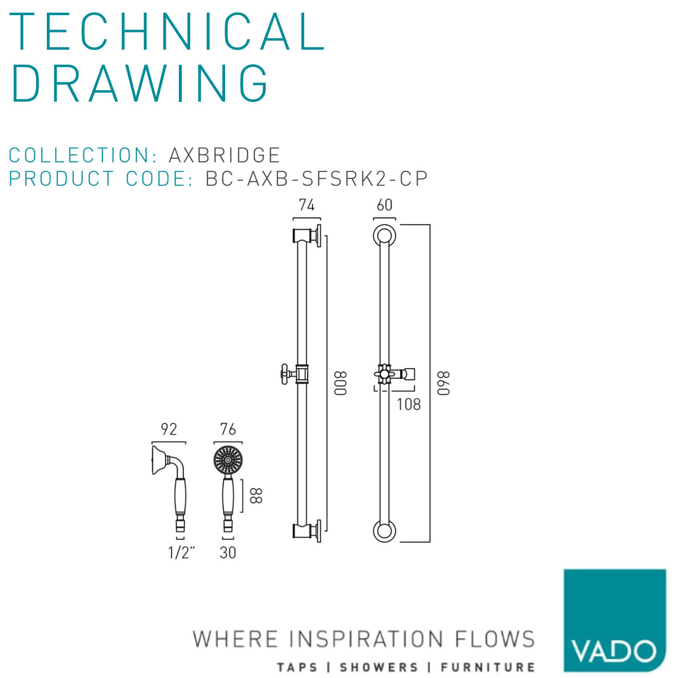 Vado Axbridge Traditional Adjstable Slide Rail Kit - Single Function Handset - 860mm Height.