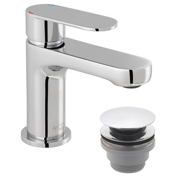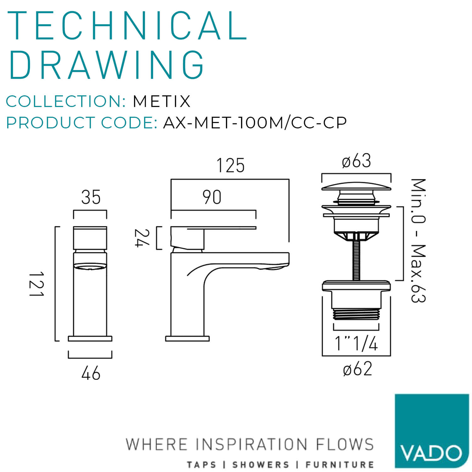 Vado Metiz Contemporary Chrome Mini Mono Basin Mixer Tap with Push Waste - Flat Handle