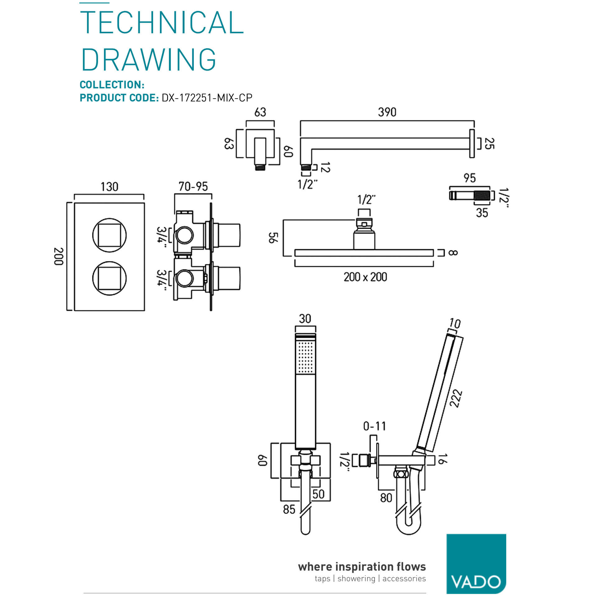 Vado Mix Concealed Thermostatic Chrome Mixer Valve with Shower Head and Handset Kit