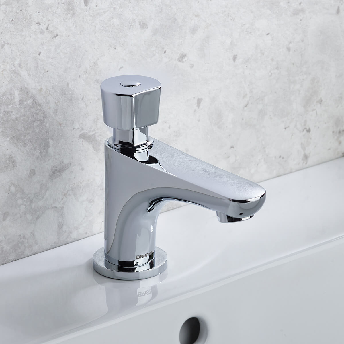Bristan Commercial Timed-Flow Chrome Finish Basin Pillar Tap - Soft-Touch Knob Handle
