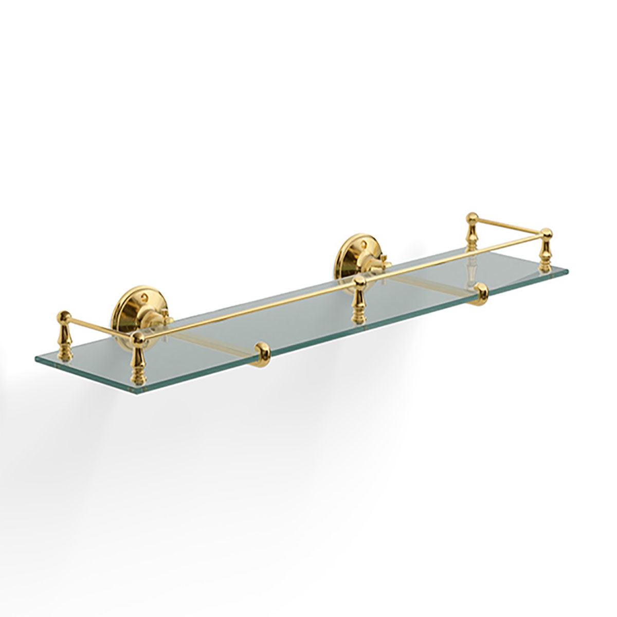 The finely-crafted Glass Shelf with Guard Rail from Millers exquisite Stockholm range exudes a look of luxury and timeless style. The wall-mounted accessory made of brass with chrome-finished guard rail and brackets has ample capacity to hold toiletries. It has a charming traditional design. For proper cleaning, it is recommended to use a mild, soapy solution and wiping it with a dry cloth.
