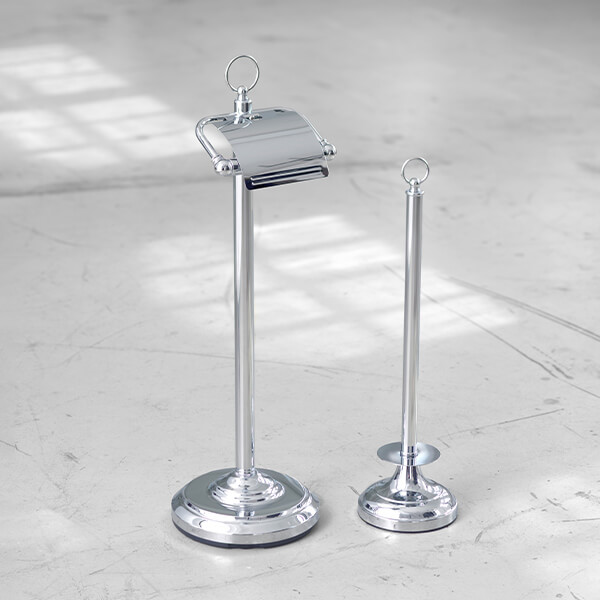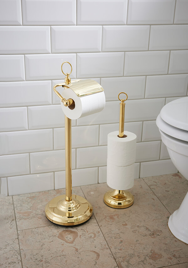 The graceful Free Standing Spare Roll Holder from Miller's Classic range of stylish bathroom accessories is aesthetically appealing, with its slim structure, graceful, fluid lines, and a classy chrome, polished brass, and brushed brass finish. Crafted to perfection from the finest materials, it features a ring at the upper end and a decorative base that provides stability while enhancing its appeal. Suitable for classic bathrooms, its serene presence packs subtle utility and is surprisingly simple to maintain.